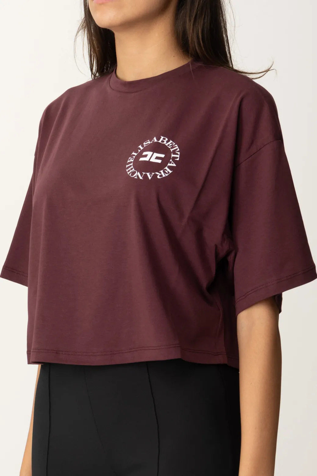 Fresca e moderna, ideale da indossare tutti i giorni, la t-shirt Elisabetta Franchi dal taglio cropped in jersey di cotone leggero è caratterizzata da stampa logo ad acqua a contrasto sul petto, il che la rende ideale per un look giovane e dinamico.