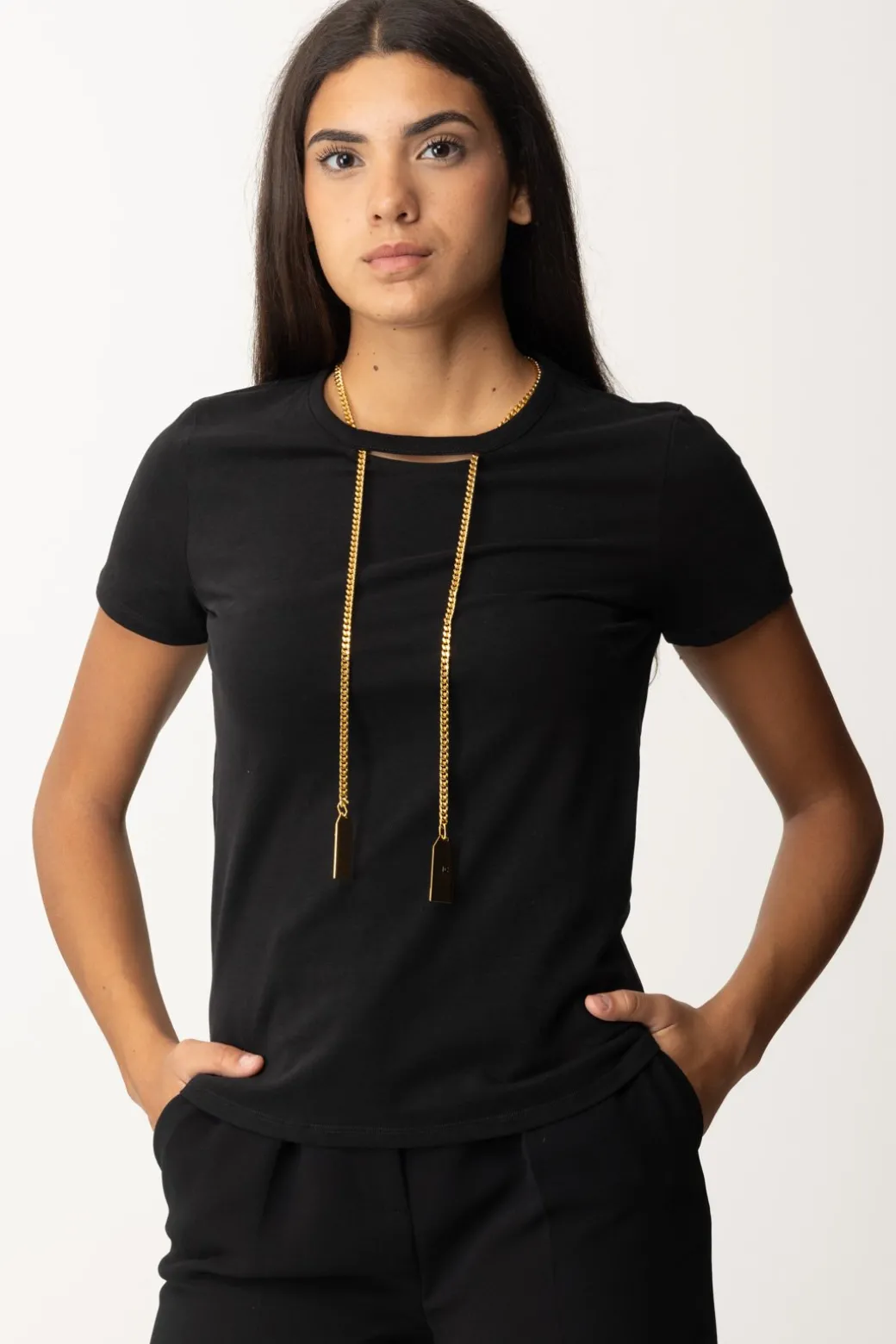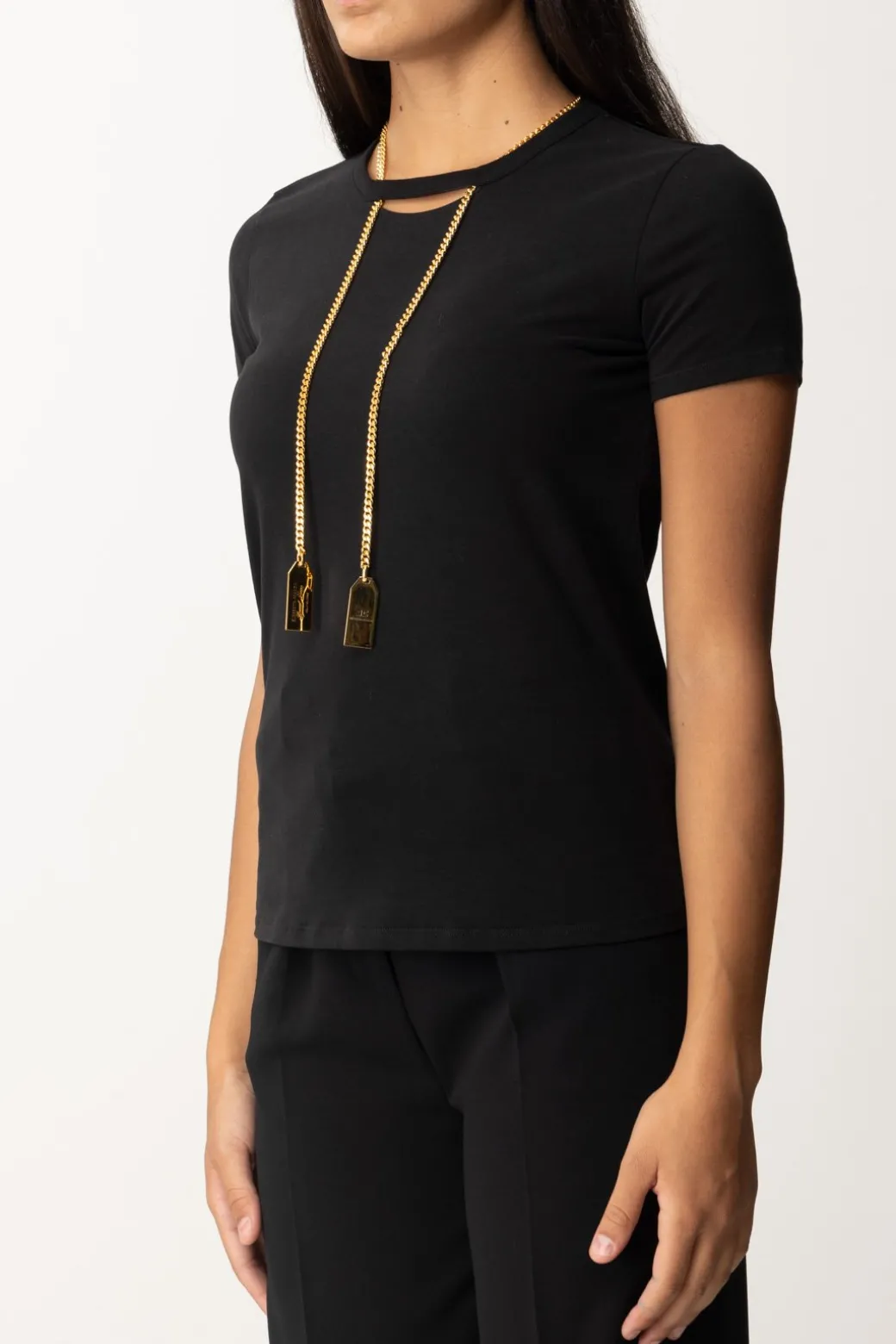 Cosa c’è di più bello di una t-shirt Elisabetta Franchi di tendenza? Una t-shirt Elisabetta Franchi completa di gioiello! In questo caso, di una bella collana con pendenti logati, che illumina i tuoi outfit e li rende subito riconoscibili. ,Realizata in morbido jersey di cotone, manica corta e girocollo, un modello pratico e versatile, chic al punto giusto.