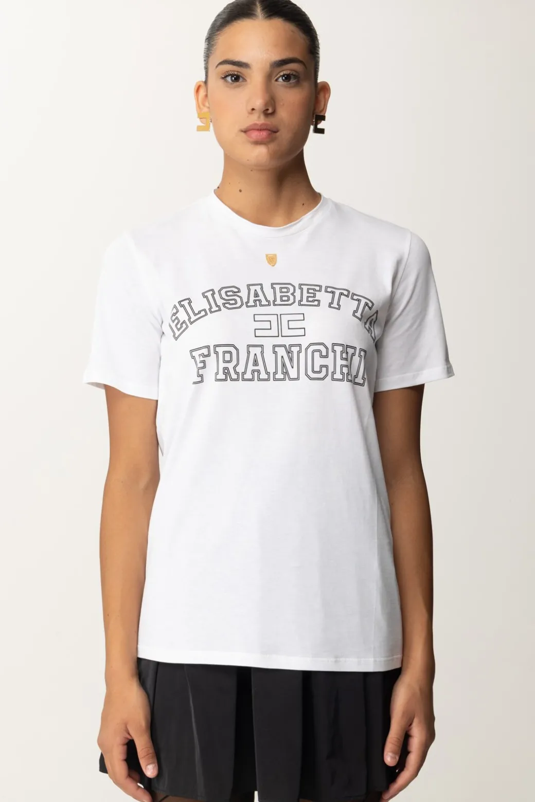 Sportiva e cool: è la t-shirt Elisabetta Franchi realizzata jersey di cotone leggero e comodo, viene impreziosita da una stampa logo stile college e patch logo dorato. Ideale per un look giovane e dinamico.