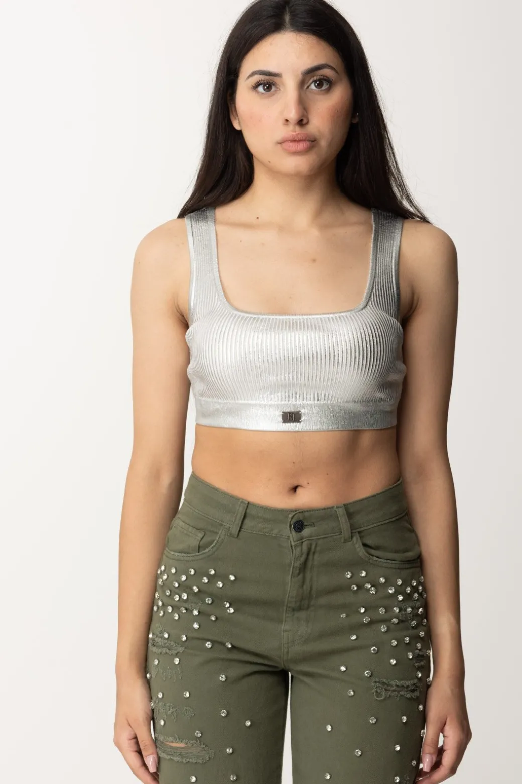 Top Elisabetta Franchi flashy ma versatile al tmepo stesso. Realizzato in viscosa effetto laminato, il taglio crop attenziona seno e punto vita, che potrai ulteriormente valorizzare con il giusto bottom. Perfetto per completare look casual-chic, con il suo tocco luminoso che spiccherà sotto giubbini in denim e cardigan all’occorrenza.