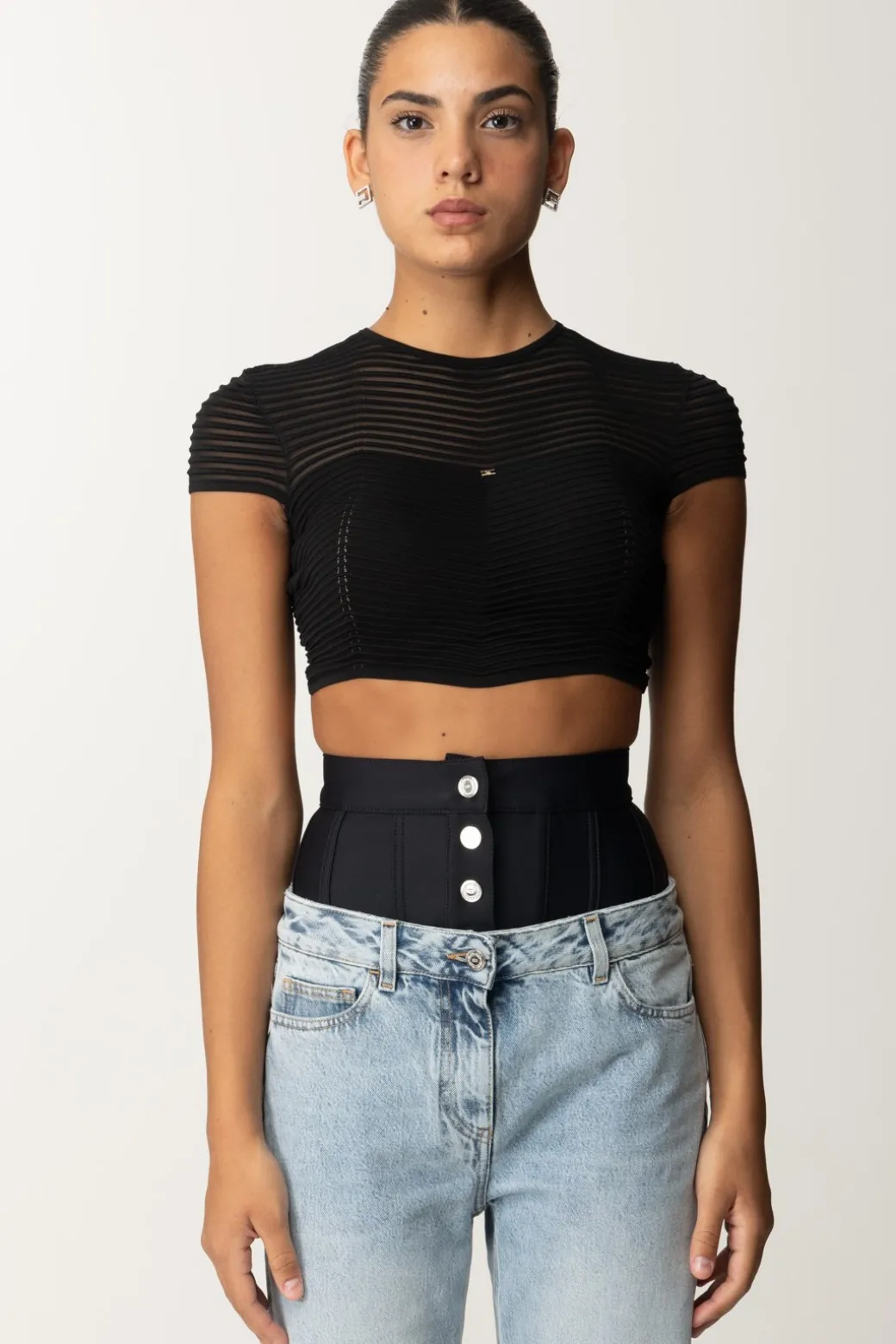 Semplice e sofisticato top in maglia Elisabetta Franchiin viscosa, caratterizzato da manichina corta, taglio crop e motivo chevron fino al fondo, alternato a punto rete nella parte alta dove crea una leggera trasparenza. Aggiungerà un tocco delicato e glamour a tutti i tuoi outfit: dal denim casual al pantalone palazzo, creando un outfit color block o giocando con i contrasti di colore. Piccolo logo CC sul fronte.