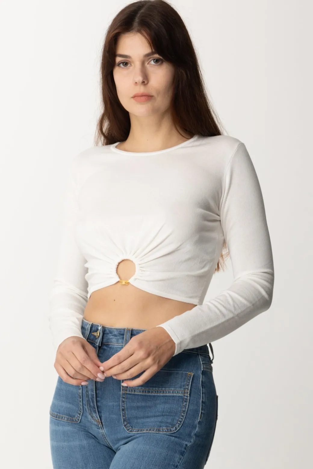 Un top Elisabetta Franchi dal taglio crop impreziosito da un accessorio gold anello posto al centro come tocco di luce. Un capo che unisce comfort e glamour.