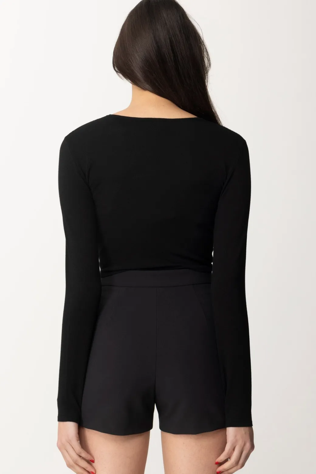 Un top Elisabetta Franchi dal taglio crop impreziosito da un accessorio gold anello posto al centro come tocco di luce. Un capo che unisce comfort e glamour.