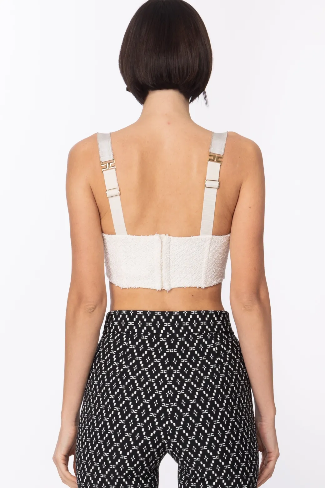 Crop top Elisabetta Franchi dal mood bon ton ed elegante, perfetto per i tuoi look raffinati. Un modello realizzato in tweed sfrangiato, con coppe, inserti di piping etnici lungo i tagli e bretelle in nastro. Da abbinare sia ad una gonna che ad un pantalone per un risultato comunque sofisticato, in perfetto stile EF.
