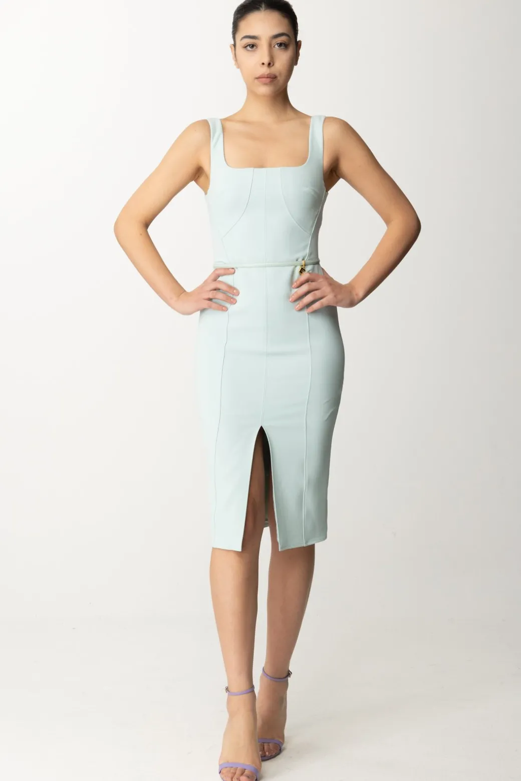 L’eleganza del tubino Elisabetta Franchi è evidente in questo abito in crêpe stretch con tagli che definiscono la silhouette. Il punto vita è accentuato da una cintura in tono, arricchita da un charm logo in metallo dorato. Un outfit sofisticato per chi ama sfoggiare uno stile impeccabile.