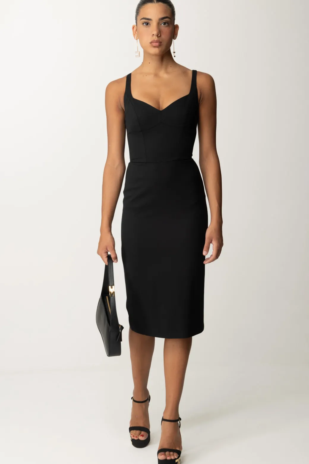 Ad ogni stagione i suoi: e questa collezione aggiunge alla sua lista dei must-have questo abito tubino Elisabetta Franchi realizzato in fresco lana mélange, con scollo curoe e tagli sul busto e in vita che definiscono al meglio la silhouette. Una mide da completare con un blazer, anche crop, e un bel paio di tacchi per completare la sua allure classy e business.