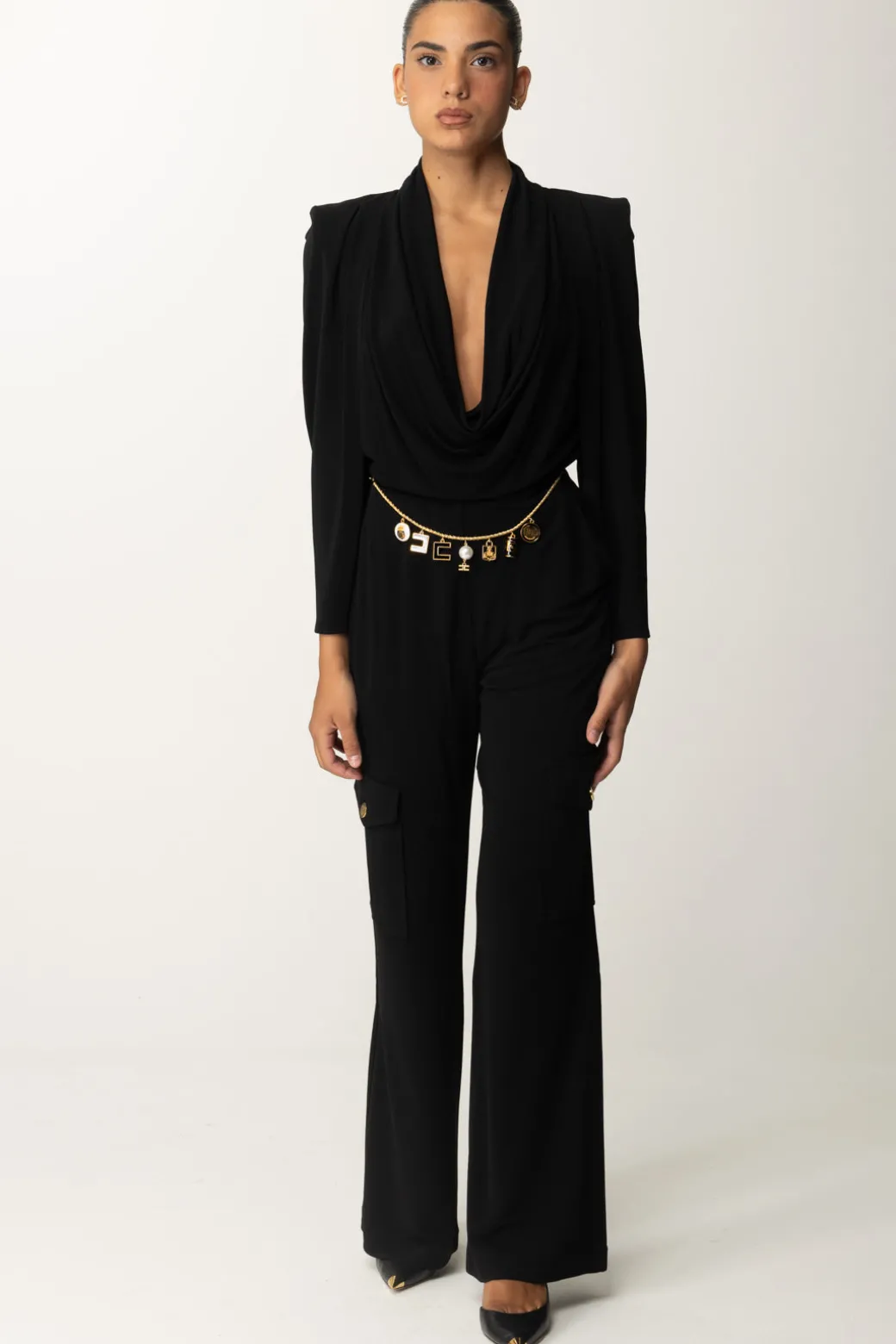Elegante e glamour al tempo stesso, questa tuta lunga Elisabetta Franchi strizza l’occhio al trend del cargo con i suoi tasconi lungo la gamba ampia, ma diventa subito più luxury grazie alla combo cintura in oro con charms e scollatura morbida e drappeggiata, così femminile! Arricchisci con un bel tacco alto e un paio di orecchini gold come la cintura e sfoggiala per i tuoi prossimi eventi di stagione.