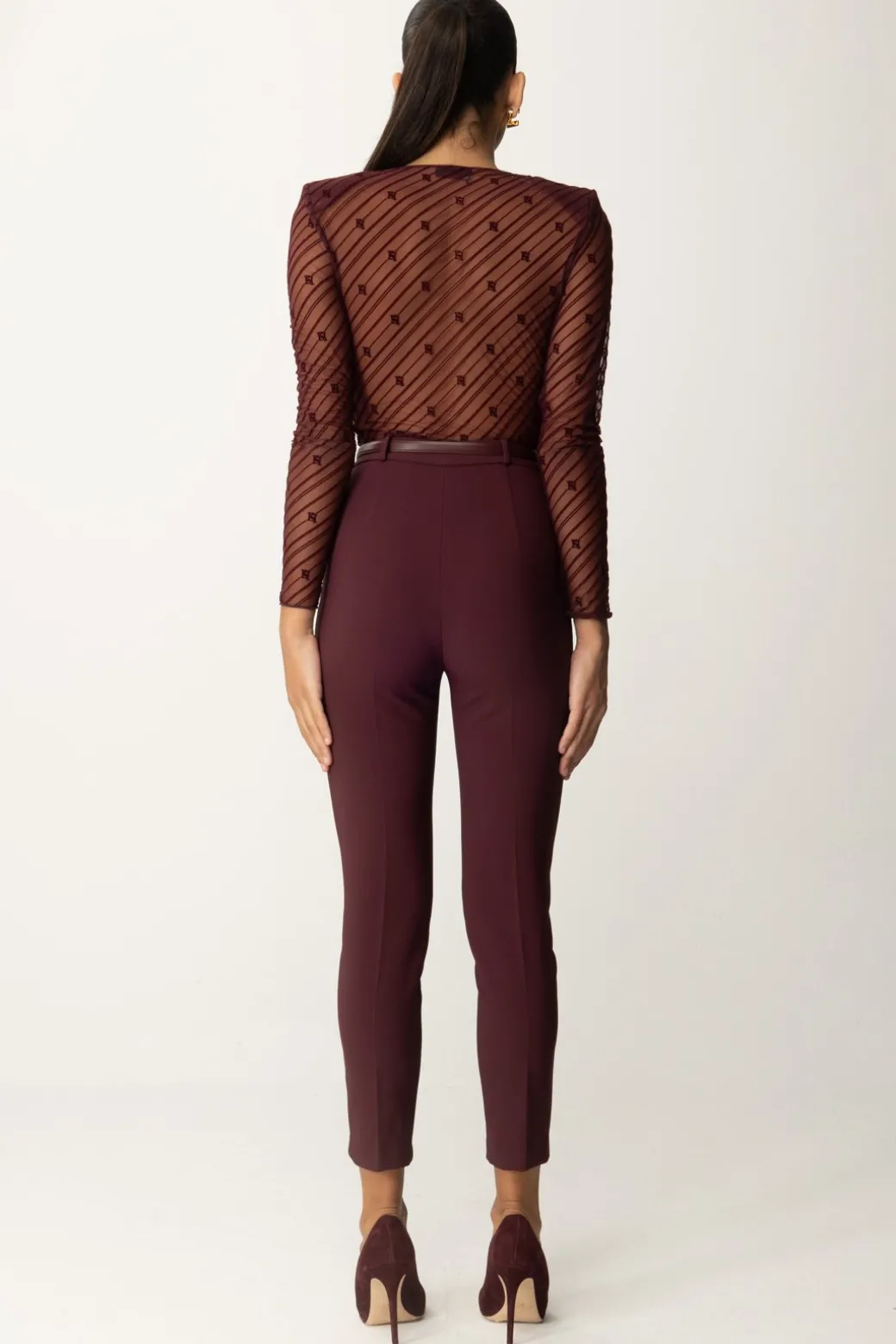 Questa tuta Elisabetta Franchi è composta da top staccabile e pantaloni slim. Il top è realizzato in tulle flock con un disegno diagonale, spalline imbottite e un sensuale scollo a V. Il pantalone evidenzia la silhouette con estremo fascino e illumina il punto vita con una cintura logata. Ideale per una serata speciale o un evento formale.