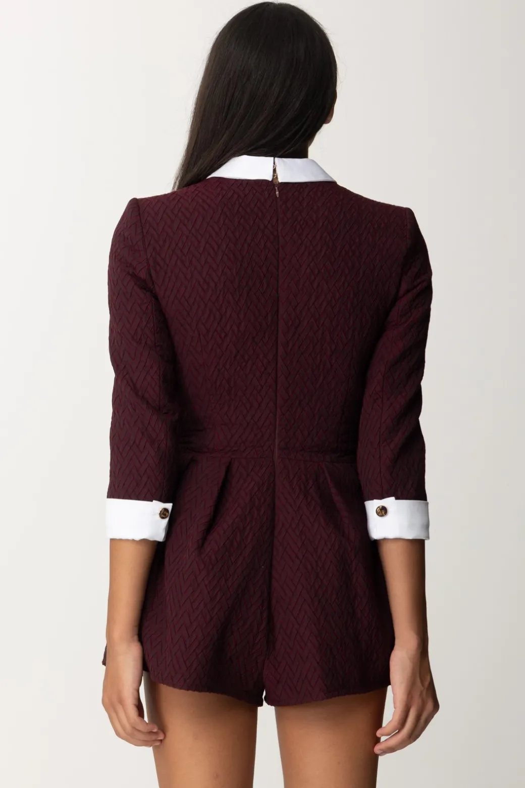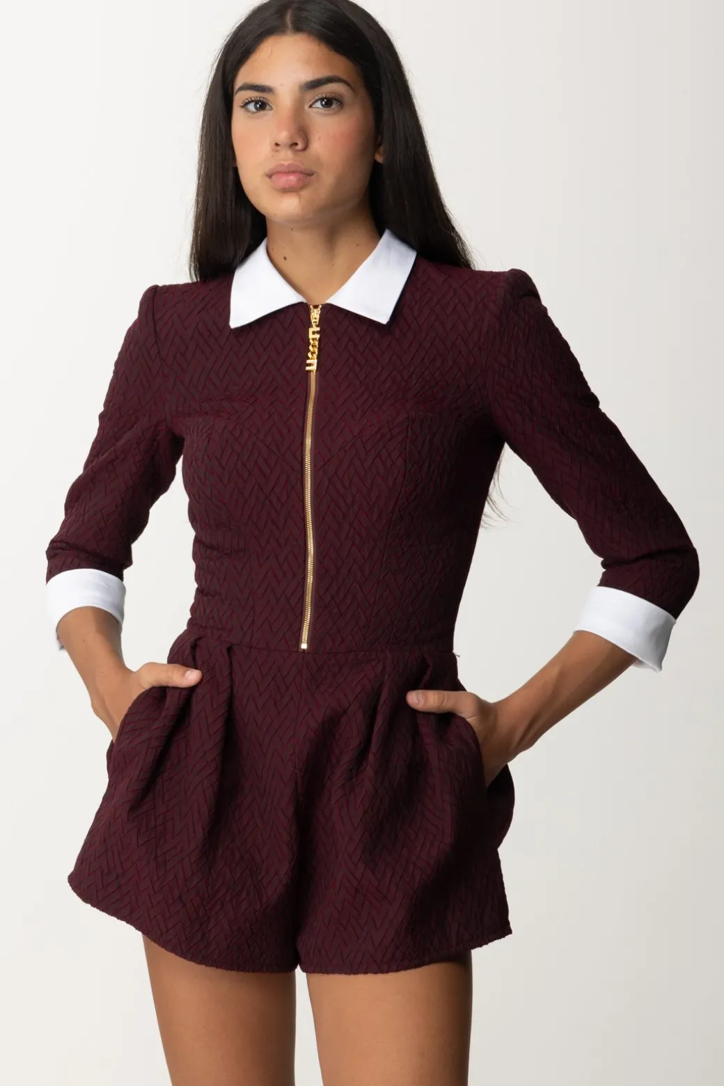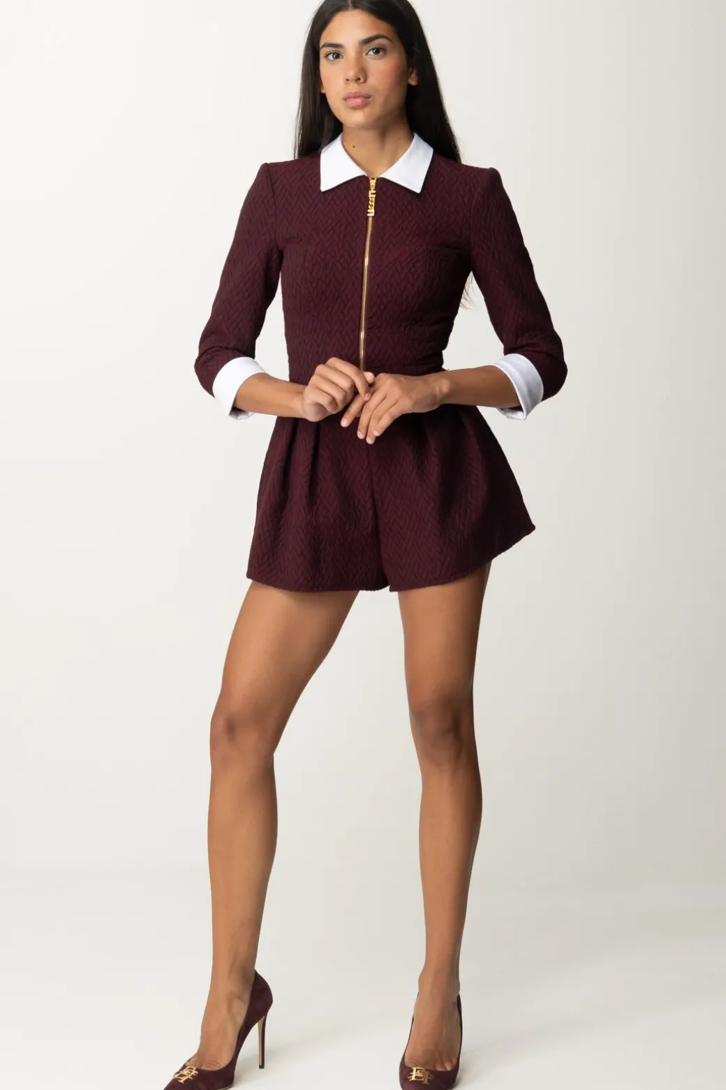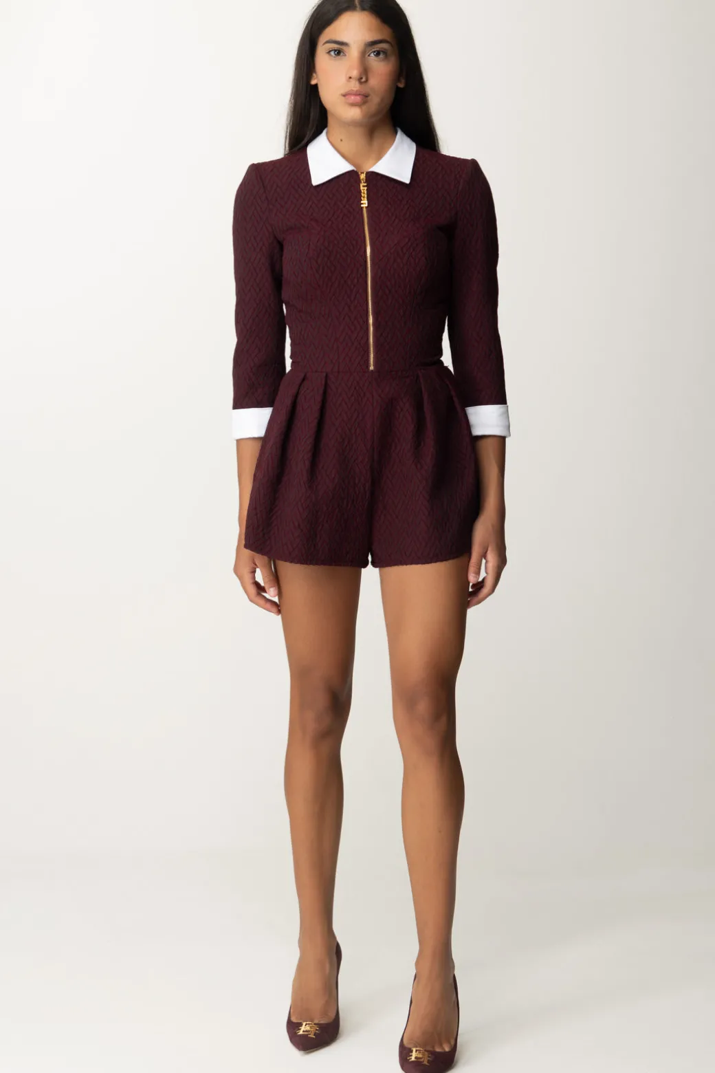 Tuta corta Elisabetta Franchi che trasmette raffinatezza ed eleganza. Con colletto e polsini a contrasto, un tessuto con un effetto zigzag e una zip frontale in oro che completano il tutto con un design d’effetto. Abbinala a sandali con tacco e una clutch dorata per un look elegante e moderno.
