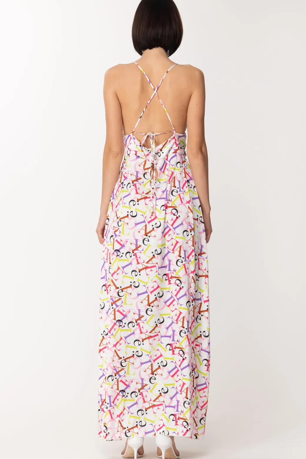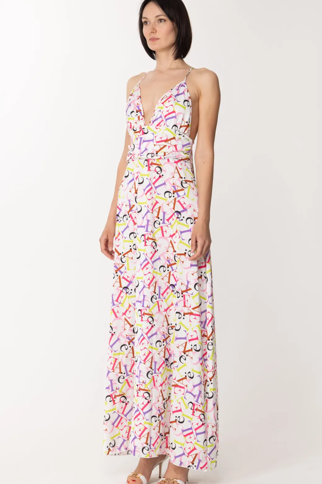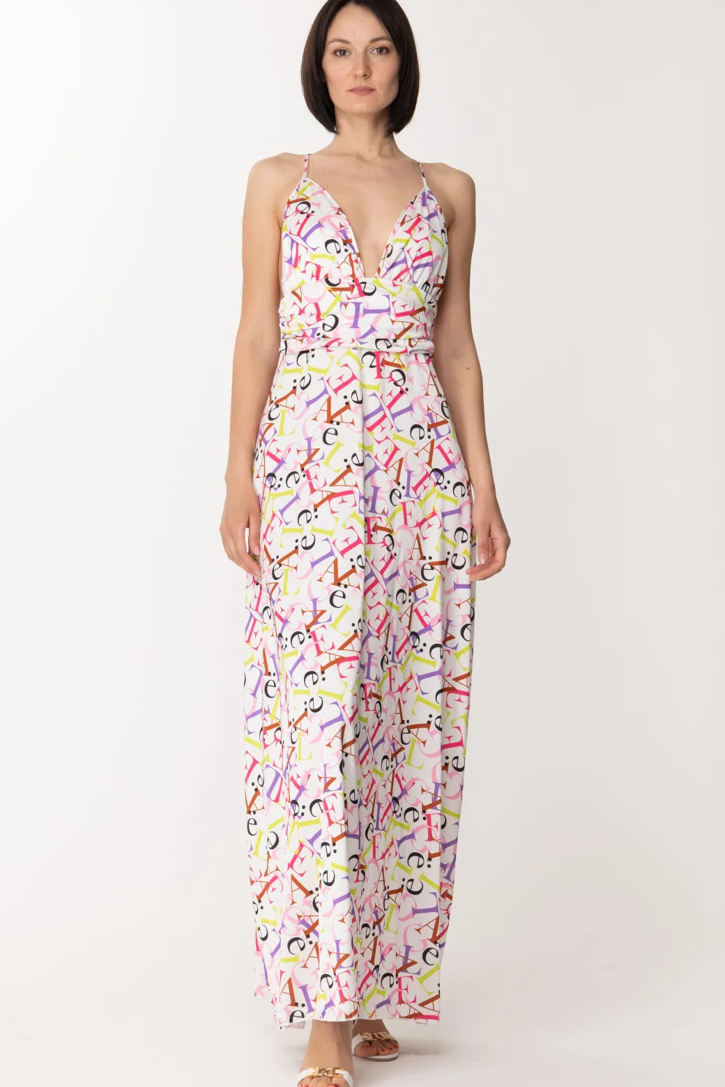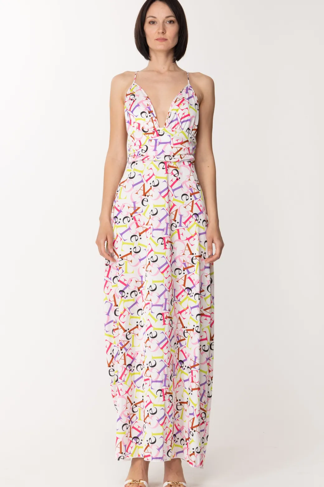 Coloratissimo e seducente questo abito Gaelle Paris: realizzato in morbido raso, dal taglio lungo e vestibilità scivolata, che segue delicatamente la silhouette, con una profonda scollatura sul davanti, bretelle ad incrocio che lasciano la schiena scoperta e punto vita enfatizzato da una fascia con morbide pieghe. A renderlo unico nel suo genere sicuramente la stampa lettering multicolor, che emana vibes estive: ideale da sfoggiare durante le tue serate estive più speciali!