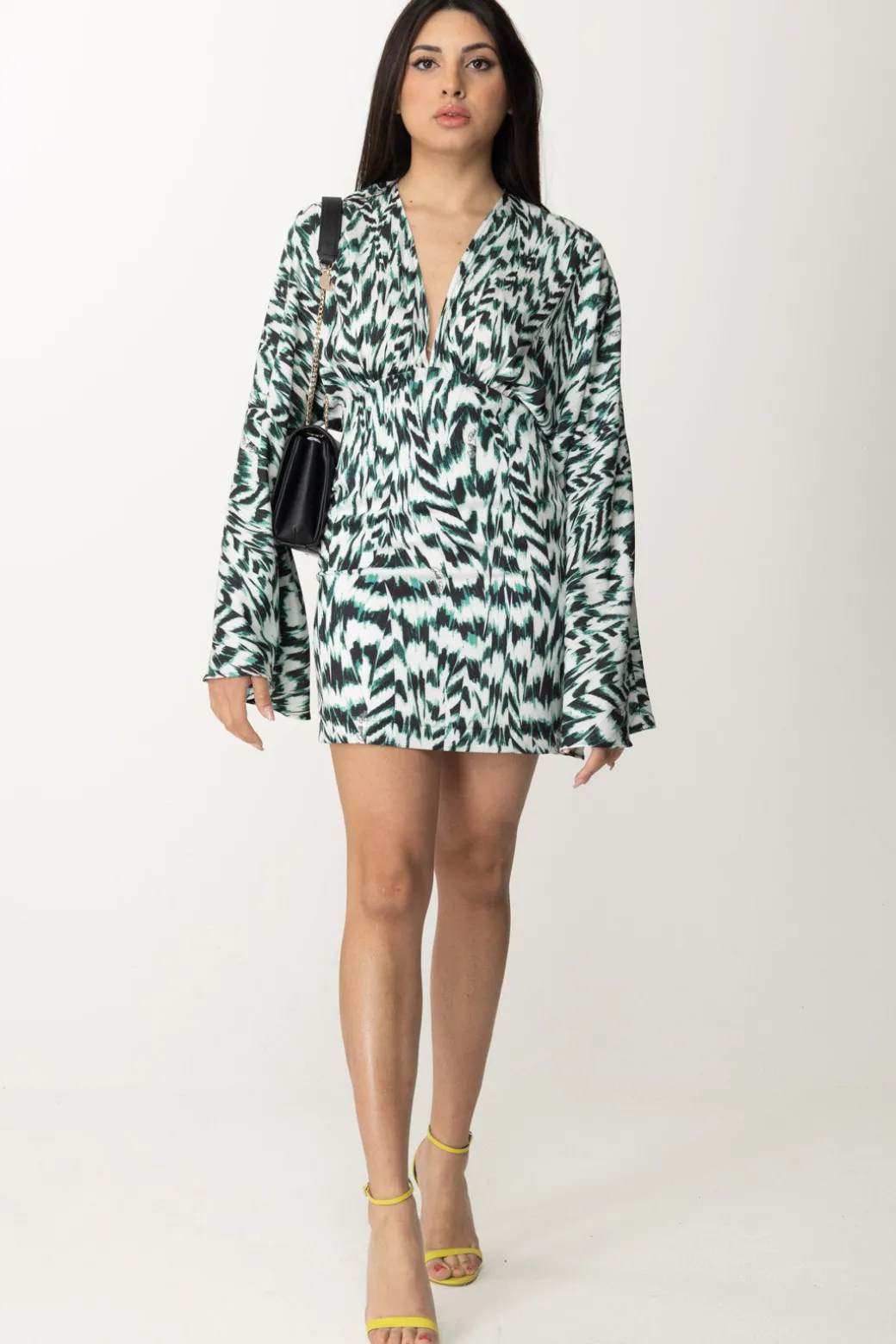 Questo mini abito Gaelle Paris è un’esplosione di colore e stile. La stampa astratta multicolor cattura l’attenzione, mentre lo scollo a V e le maniche ampie offrono un tocco di freschezza e movimento. Il fit aderente sulla gonna bilancia il volume delle maniche, creando un look vivace e accattivante.