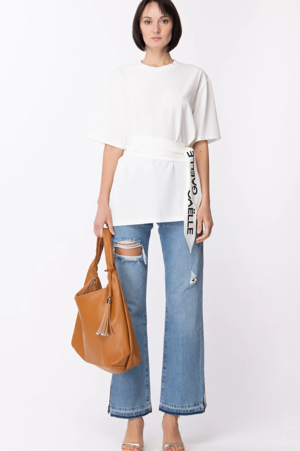 Essenziale sì, originale ancor di più! Il lato più chic della t-shirt sfoggia in questa firmata Gaelle: ha un fit lungo, maniche ampie a 3/4 e impreziosita da una fusciacca che evidenzia il punto vita in cui spicca il logo del brand a contrasto. Sarà la compagna perfetta di mille outfit!