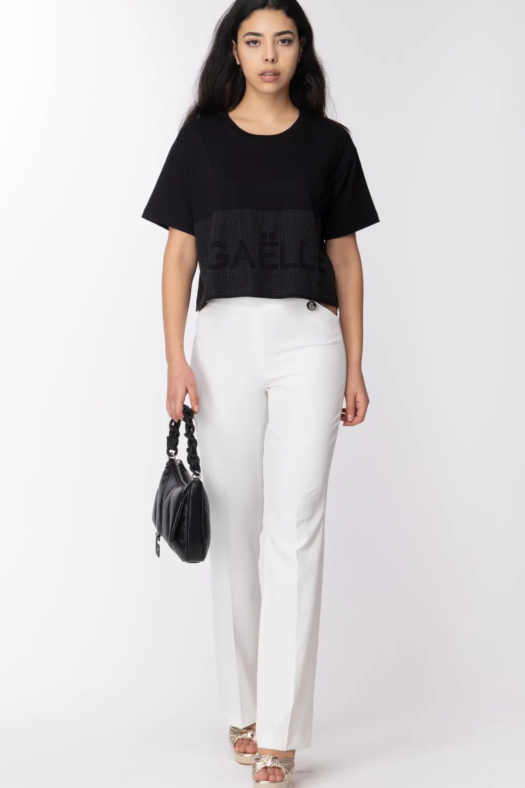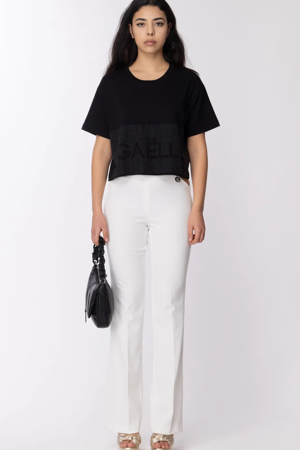 Essenziale sì, glam ancor di più! Il lato più chic della t-shirt sfoggia in questa firmata Gaelle: ha un fit corto asimmetrico, maniche ampie a 3/4, e impreziosita da strass in tono che creano il disegno del logo. Sarà la compagna perfetta di mille outfit!