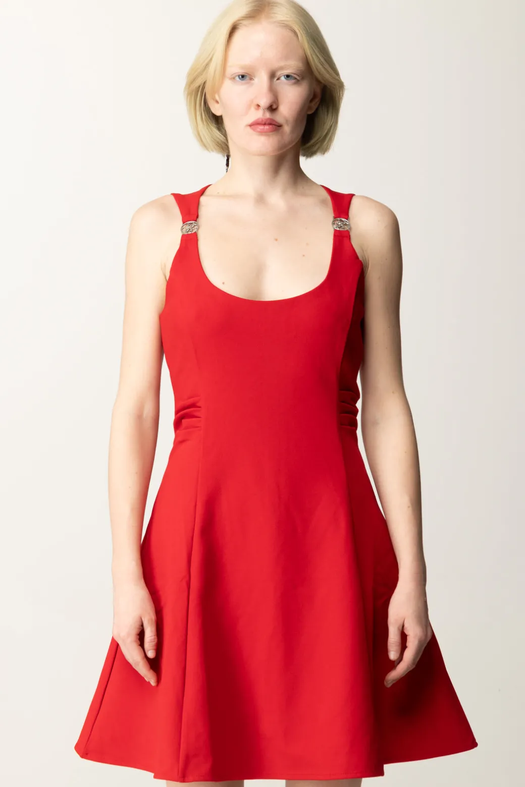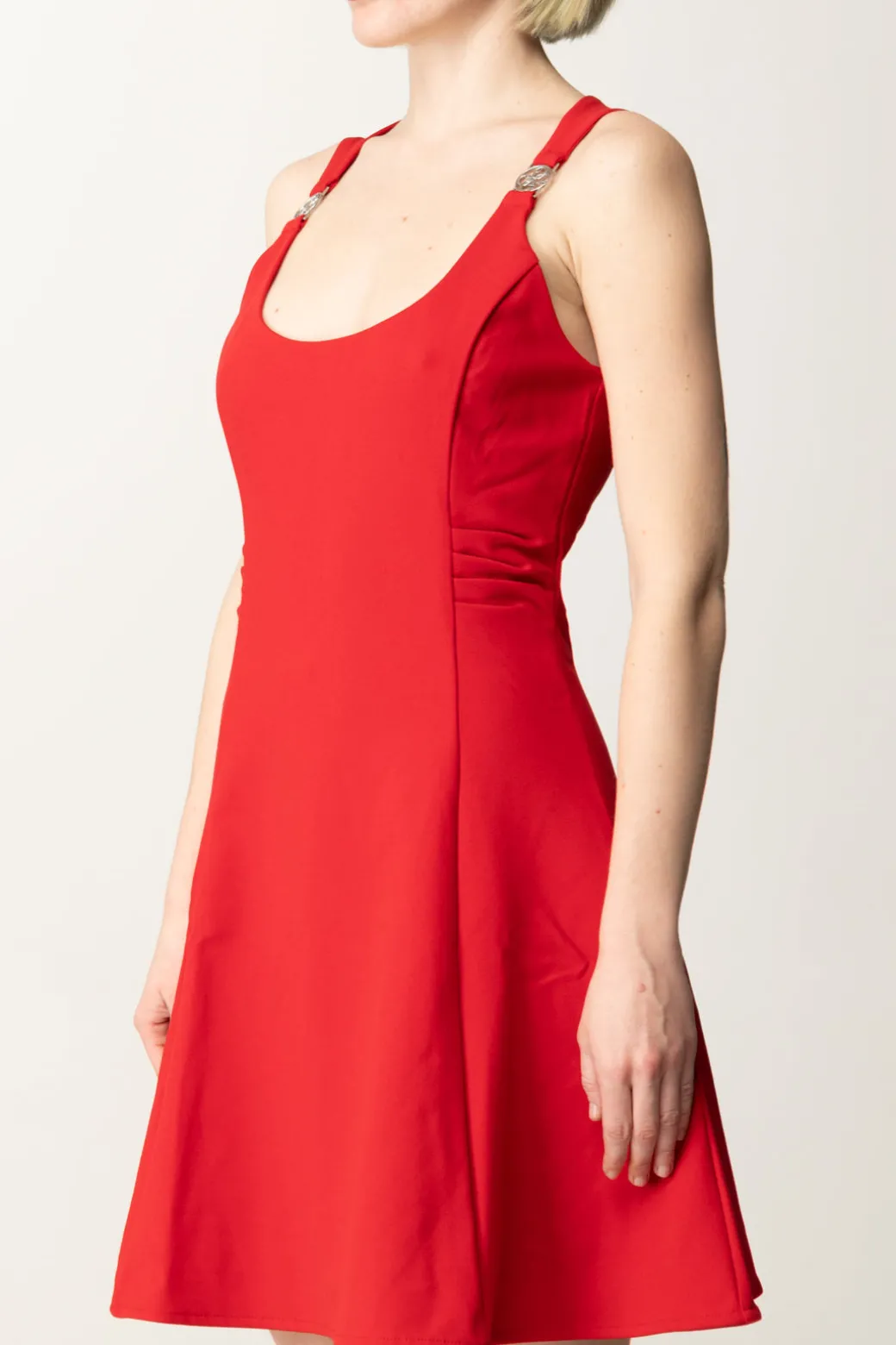 Abito corto Guess in stile coktail dress, elegante e femminile nella sua semplicità. Impreziosito da dettagli gioiello sulle spalline, che aggiungono un tocco sofisticato e glamour, la gonna svasata e il tessuto fluido garantiscono una silhouette perfetta per occasioni speciali o serate eleganti. Completa con un tronchetto per un risultato più frizzantino o con una decolletes per un look classico e chic senza tempo.