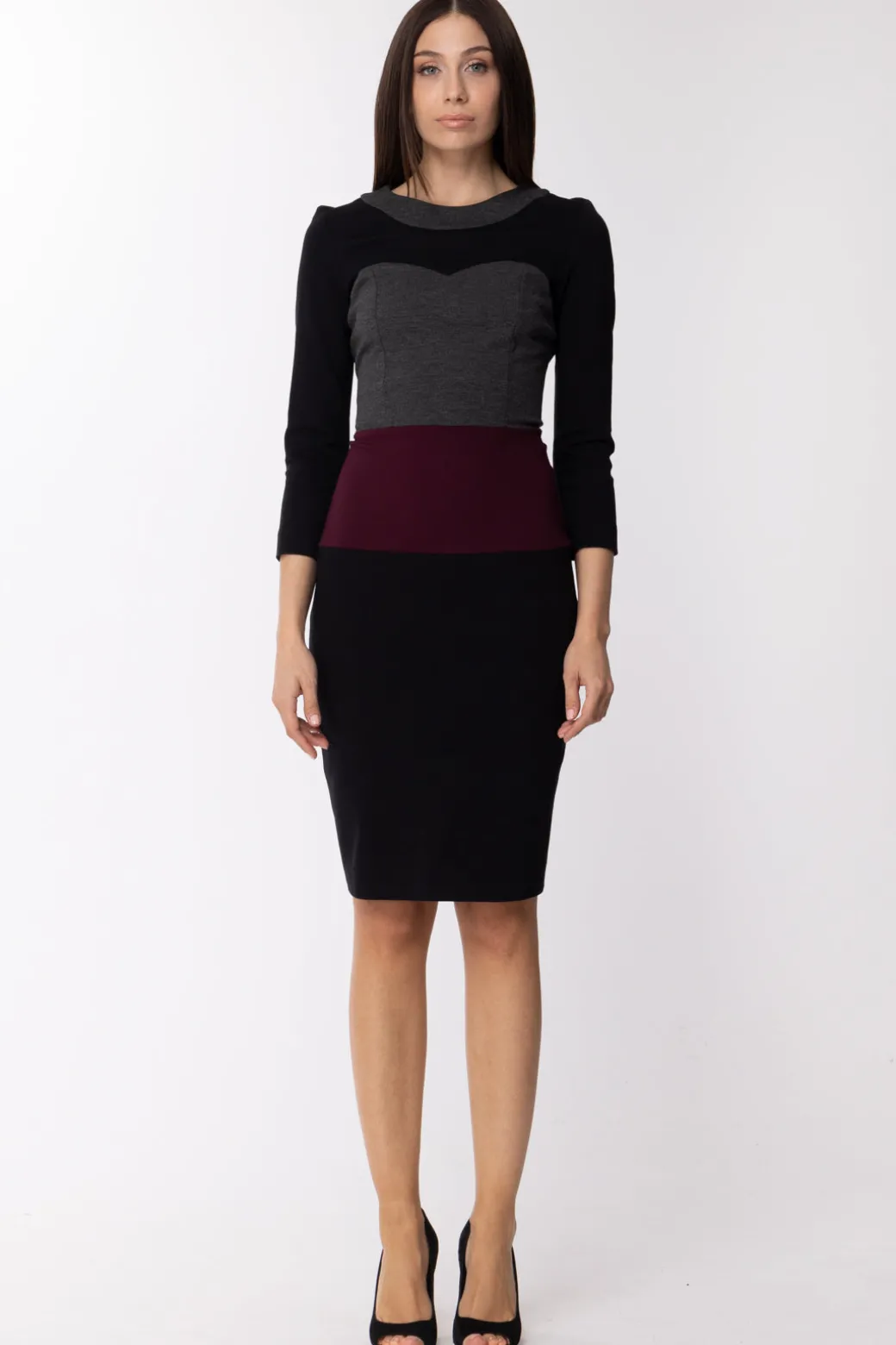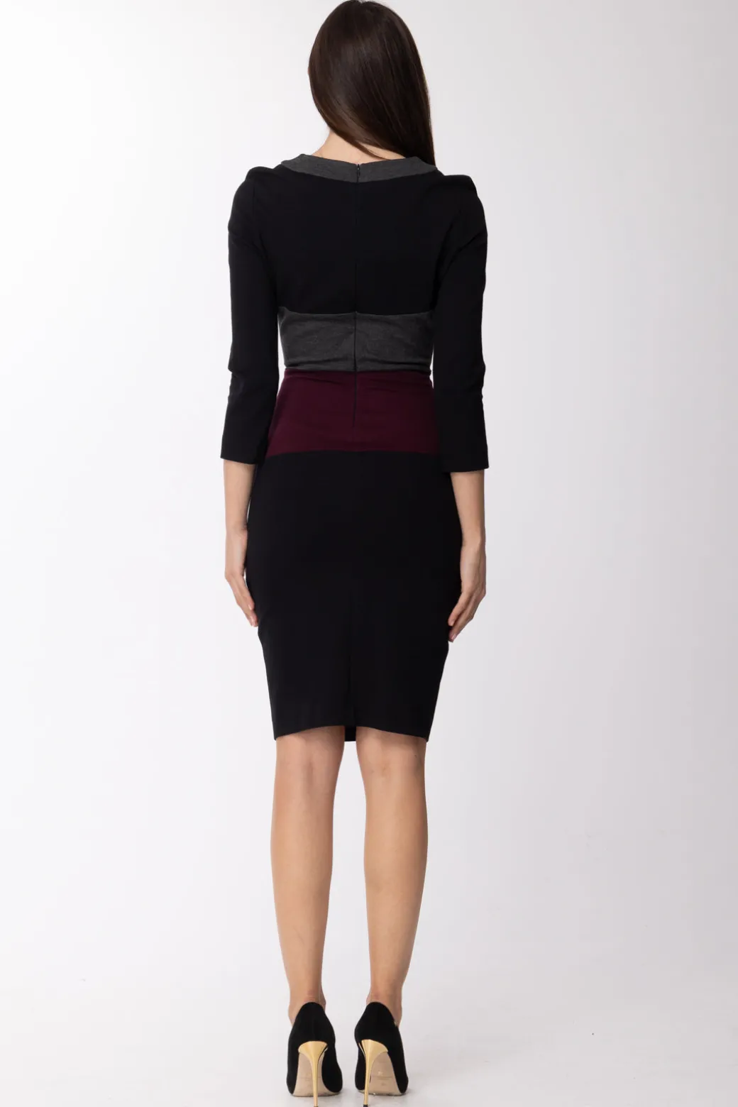 Un abito longuette dalla vestibilità aderente, che ti accompagnerà nelle occasioni formali. Realizzato in tessuto di tre tonalità differenti, con maniche a 3/4, girocollo ampio e una finta scollatura a cuore che gli conferisce un aspetto ancor più elegante e raffinato.