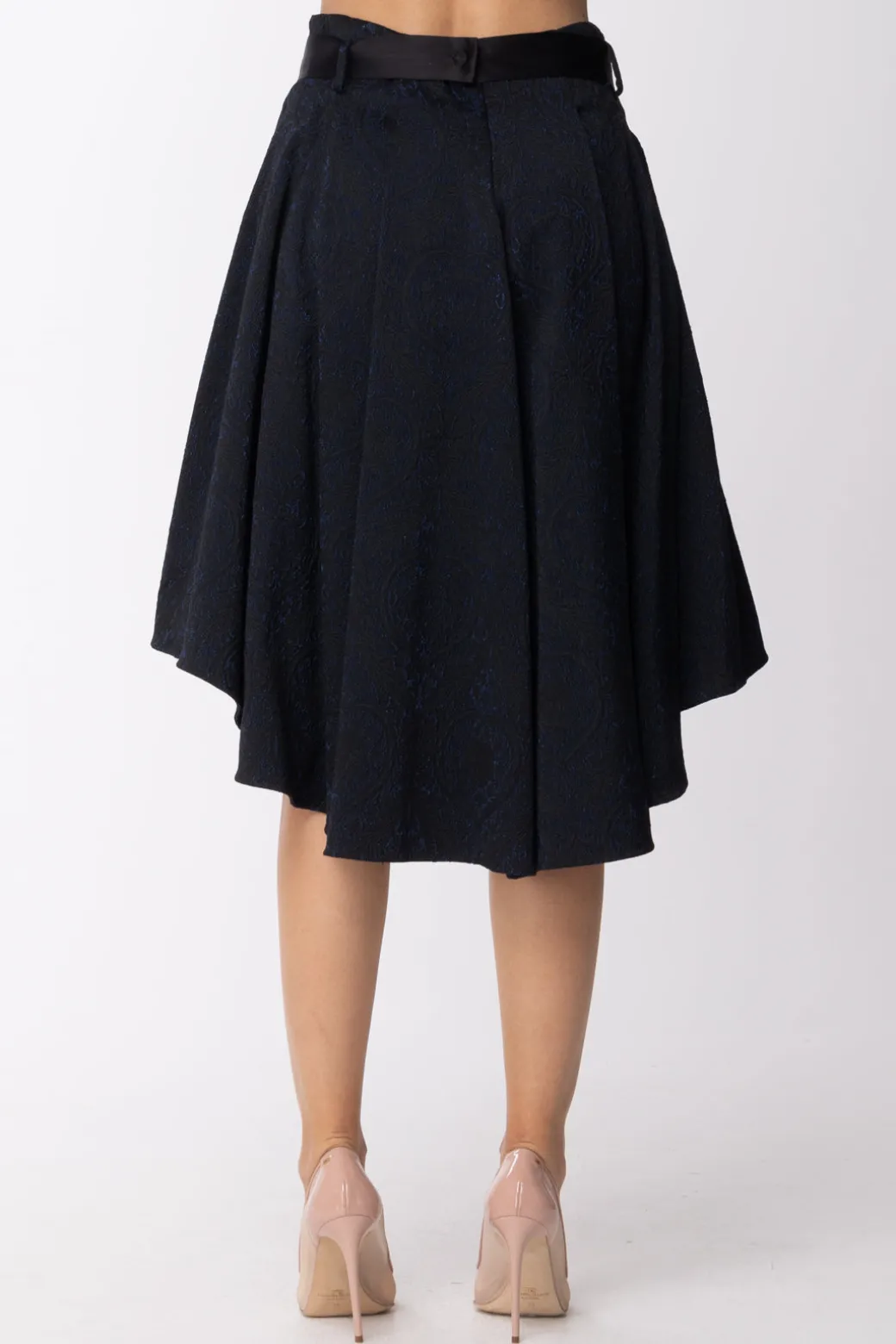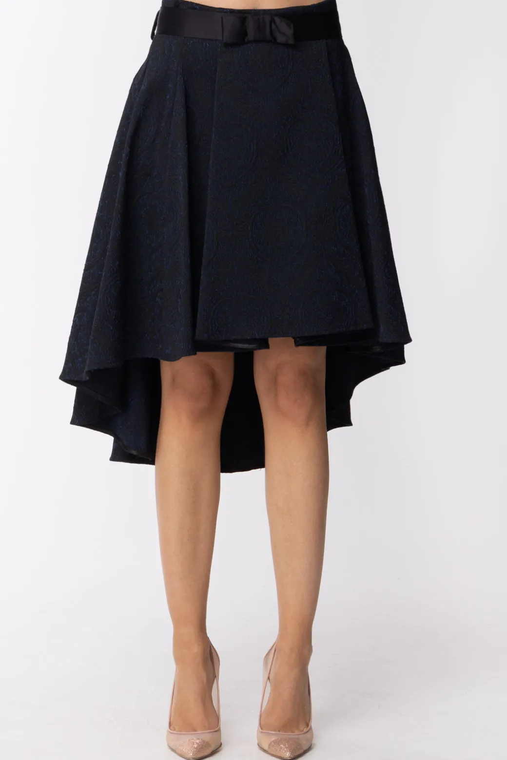 Un’elegante gonna in tessuto damascato, dal taglio asimmetrico, perfetta per le occasioni più chic: caratterizzata da piegoni che donano movimento al capo e da una cintura in raso con fiocco che enfatizzano il punto vita.