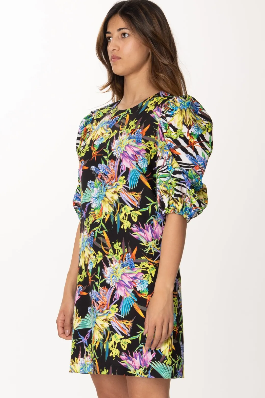 Abito Just Cavalli dalla fantasia più grintosa che mai! Fit morbido e ampio, con stampa che contrasta con lo sfondo nero decorando l’abito con una fantasia floreale dai colori brillanti. Puoi completare il tutto con accessori e gioielli sobri per renderlo protagonista!