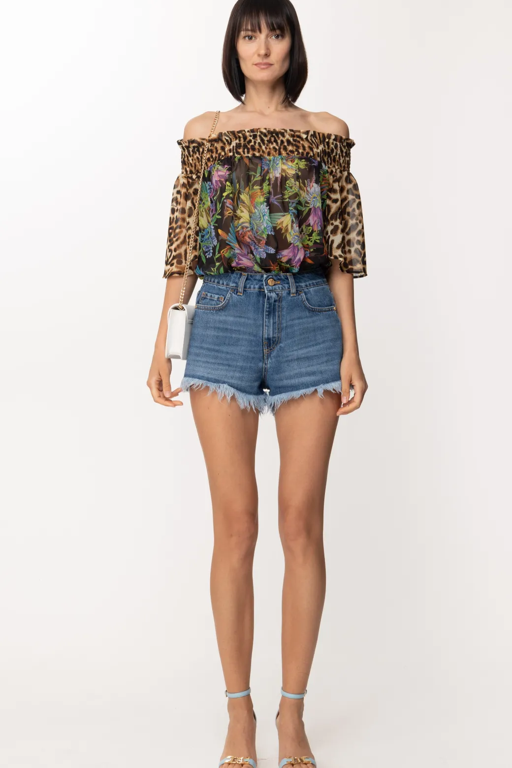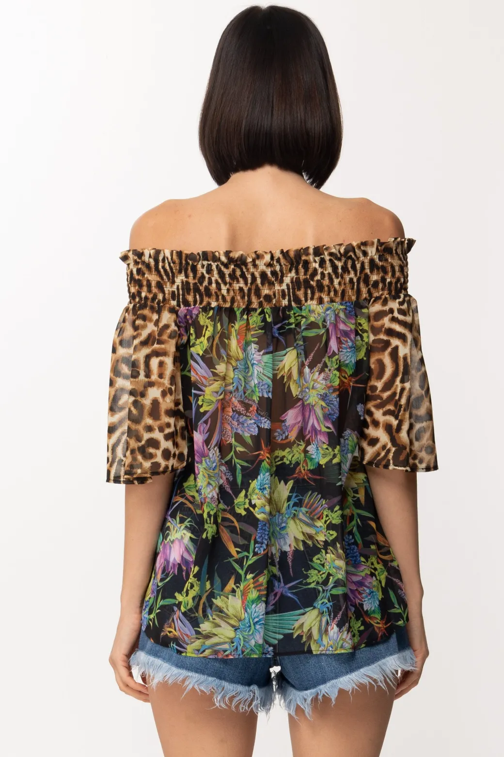 Blusa Just Cavalli dal tessuto leggero e svolazzante, impreziosita da una stampa che mixa l’animalier e un colorato paesaggio floreale, l’unione perfetta tra audacia e femminilità!