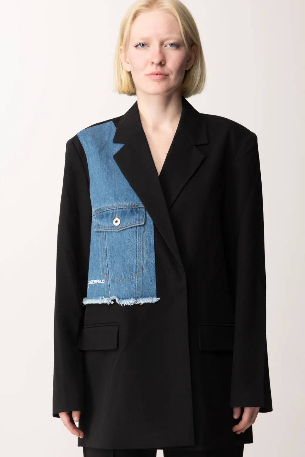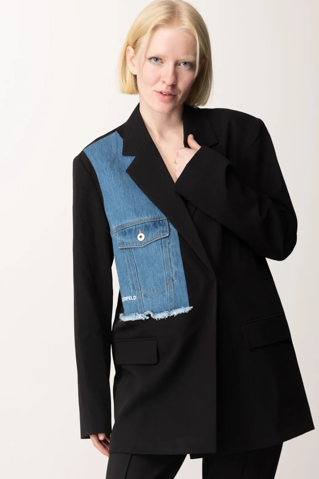 Questo Blazer Karl Lagerfeld dal design audace, combina tailoring classico con un twist contemporaneo, grazie all’inserto in denim che spezza la struttura formale. Perfetto per chi ama mixare stili diversi, è un capo versatile che si adatta sia a un look da ufficio che a un outfit casual. Indossalo con pantaloni cropped e sneakers per un look urban chic, oppure opta per tacchi alti e una clutch per un’occasione più elegante.