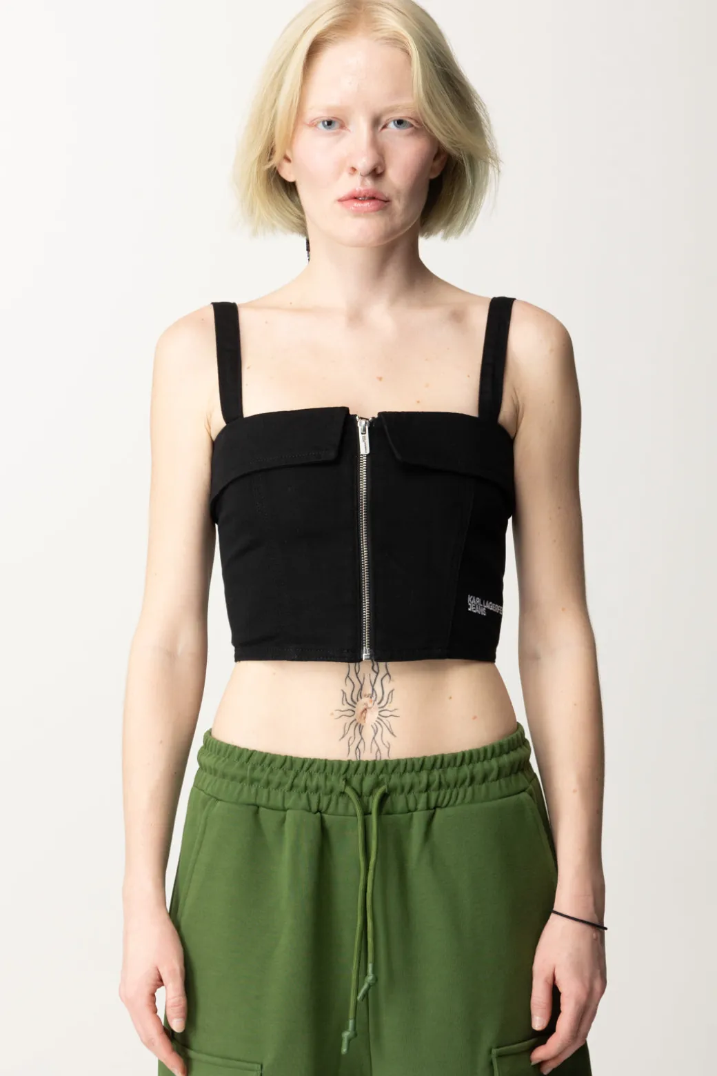 Questo top Karl Lagerfeld dal taglio strutturato è caratterizzato da una chiusura frontale con zip, spalline ampie che donano un tocco grintoso e il logo lattering su un lato. Perfetto per outfit dal mood spoty-chic, può essere abbinato a pantaloni cargo per un look streetwear da completare con chunky sneakers o ankle boots per un appeal edgy.