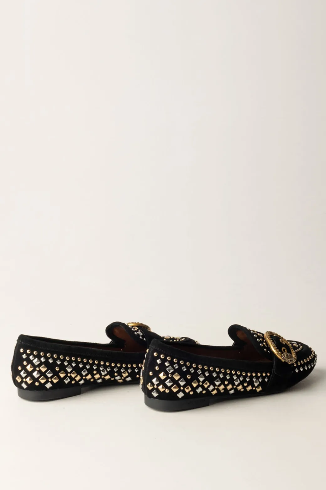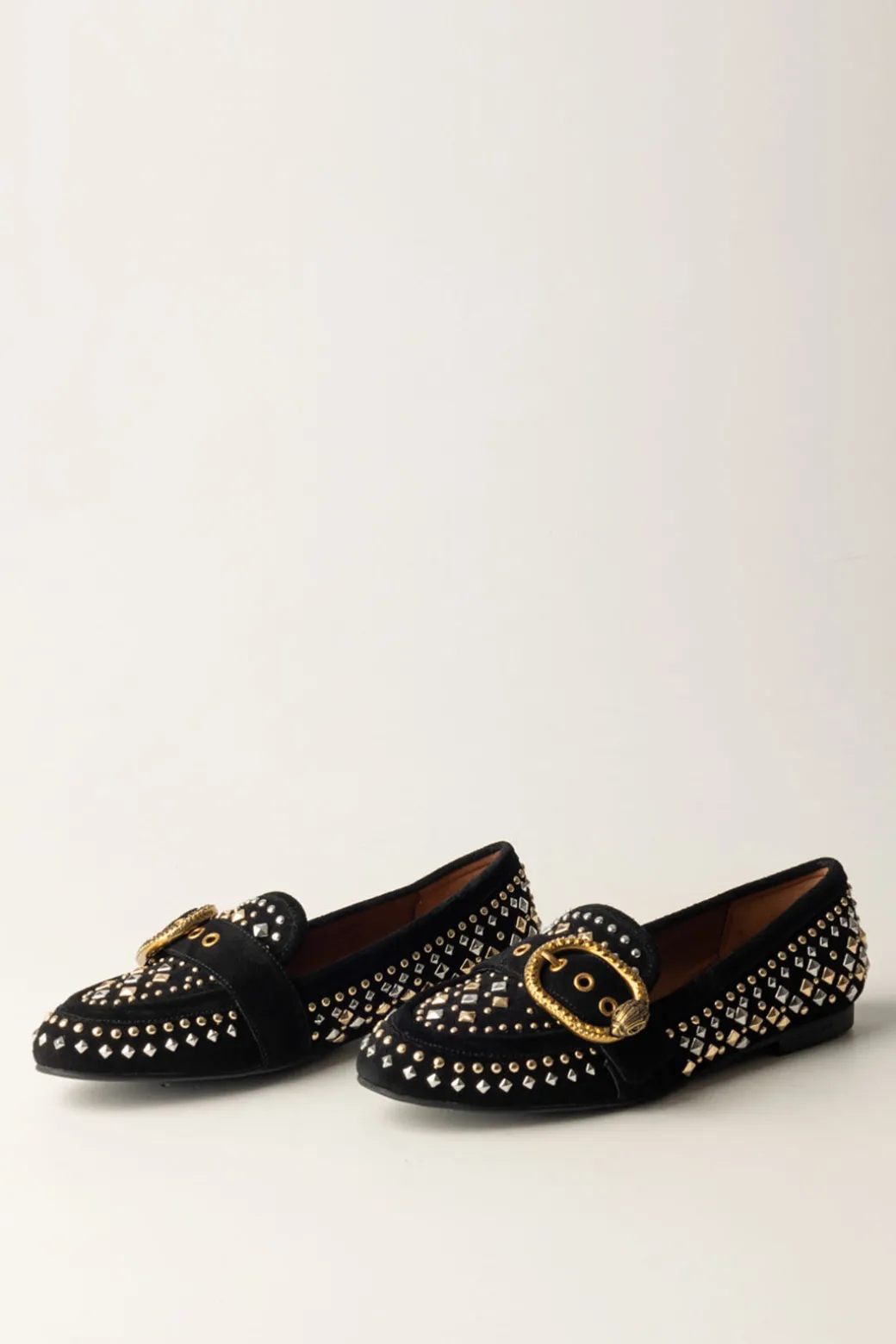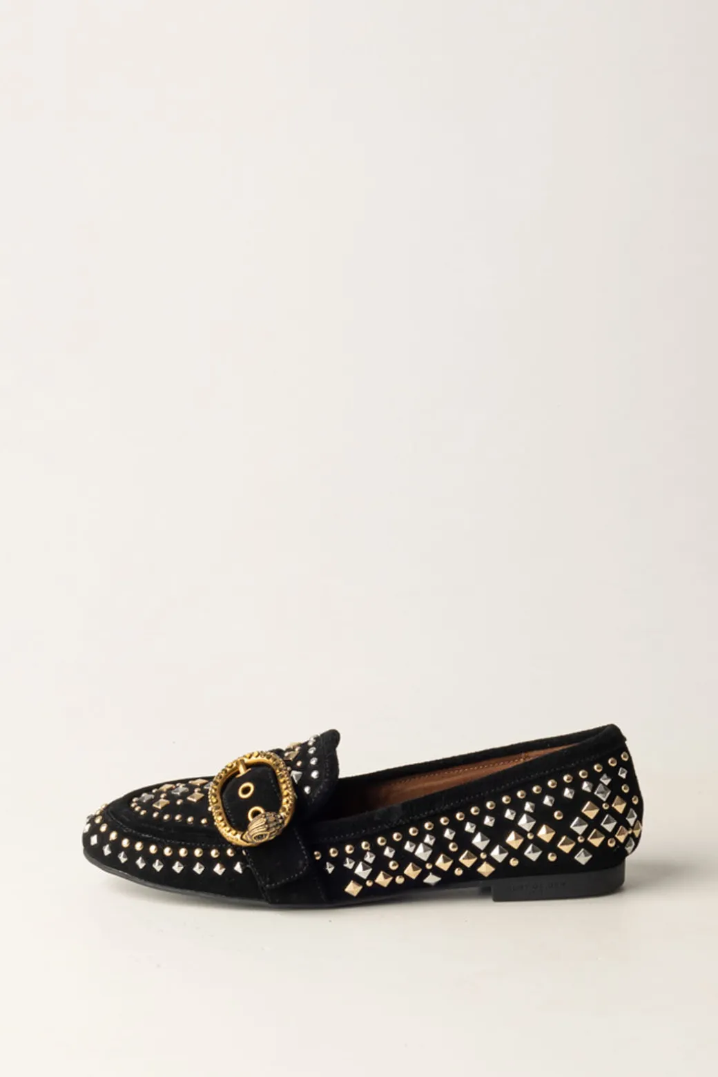 Mocassini Kurt Geiger dal modello flat, impreziositi da borchie lucenti e una fibbia frontale con logo. L’equilibrio tra stile rock e raffinatezza li rende adatti sia per l’ufficio che per uscite serali. Indossali con un paio di pantaloni cropped o un abito morbido per un tocco di carattere.