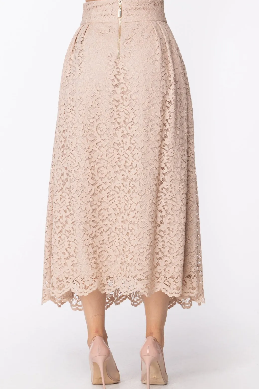 Gonna longuette Mangano caratterizzata da un bel disegno in pizzo nella sua interezza. Vita alta e design svasato dai fianchi in giù, un classico evergreen da abbinare a tantissime ipologie di top e slanciare con tacchi alti.