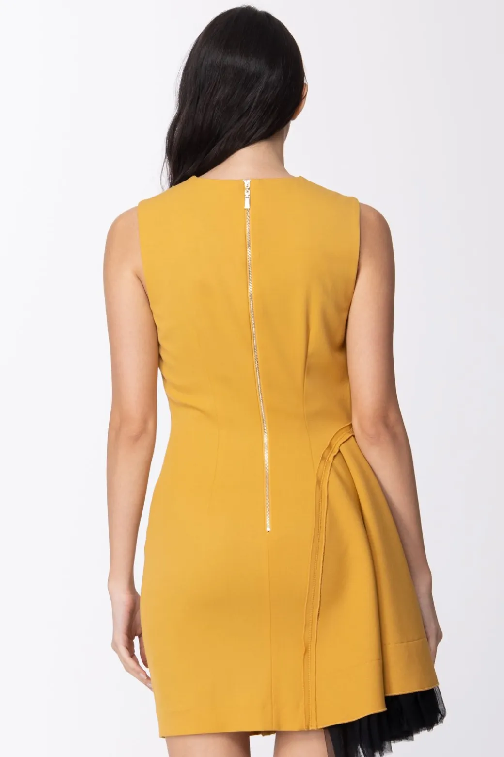 Mangano Mangano: Abito Asimmetrico Smanicato con Trama Diagonale Impunture e Cuciture EsterneSENAPE