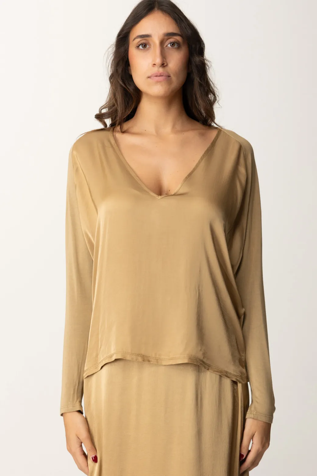 Questa blusa Manila Grace a maniche lunghe in satin è perfetta per un look effortless chic. Il taglio leggero e il dettaglio del collo a V la rendono ideale per essere indossata sia di giorno che di sera. Per un outfit rilassato ma d’effetto, abbinala con dei jeans e degli ankle boots in pelle, oppure con la gonna in coordinato per un look monocromatico.