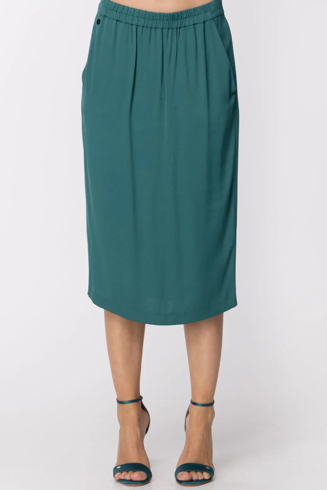 Una gonna dal design versatile, che ti permette di abbinarla ai più svariati look, da quelli formali a quelli più casual chic. Caratterizzata da un taglio midi, con cinturino elasticizzato che definisce il punto vita e spacco sul retro.