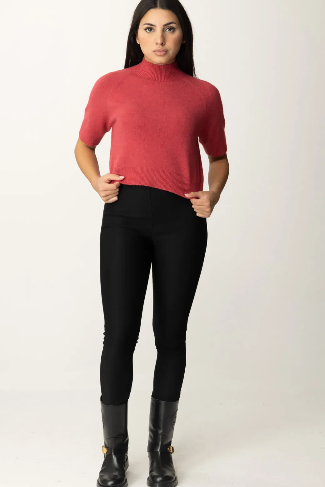 Versatile e femminile maglia Manila Grace in misto viscosa, con taglio crop che ben si presta a valorizzare la tua silhouette insieme a bottom a vita alta. Maniche corte e collo alto rifiniti con ordli a costine, un capo semplice e pratico per i tuoi look da tutti i giorni, da indossare anche in combinazione con blazer in lana e cardigan.
