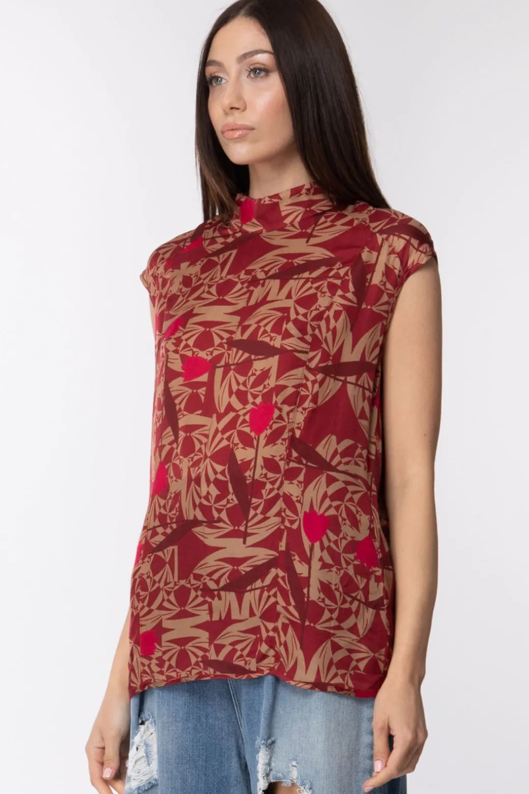 Manila Grace Top a Lupetto In Seta StampataROSSO CARRMINIO