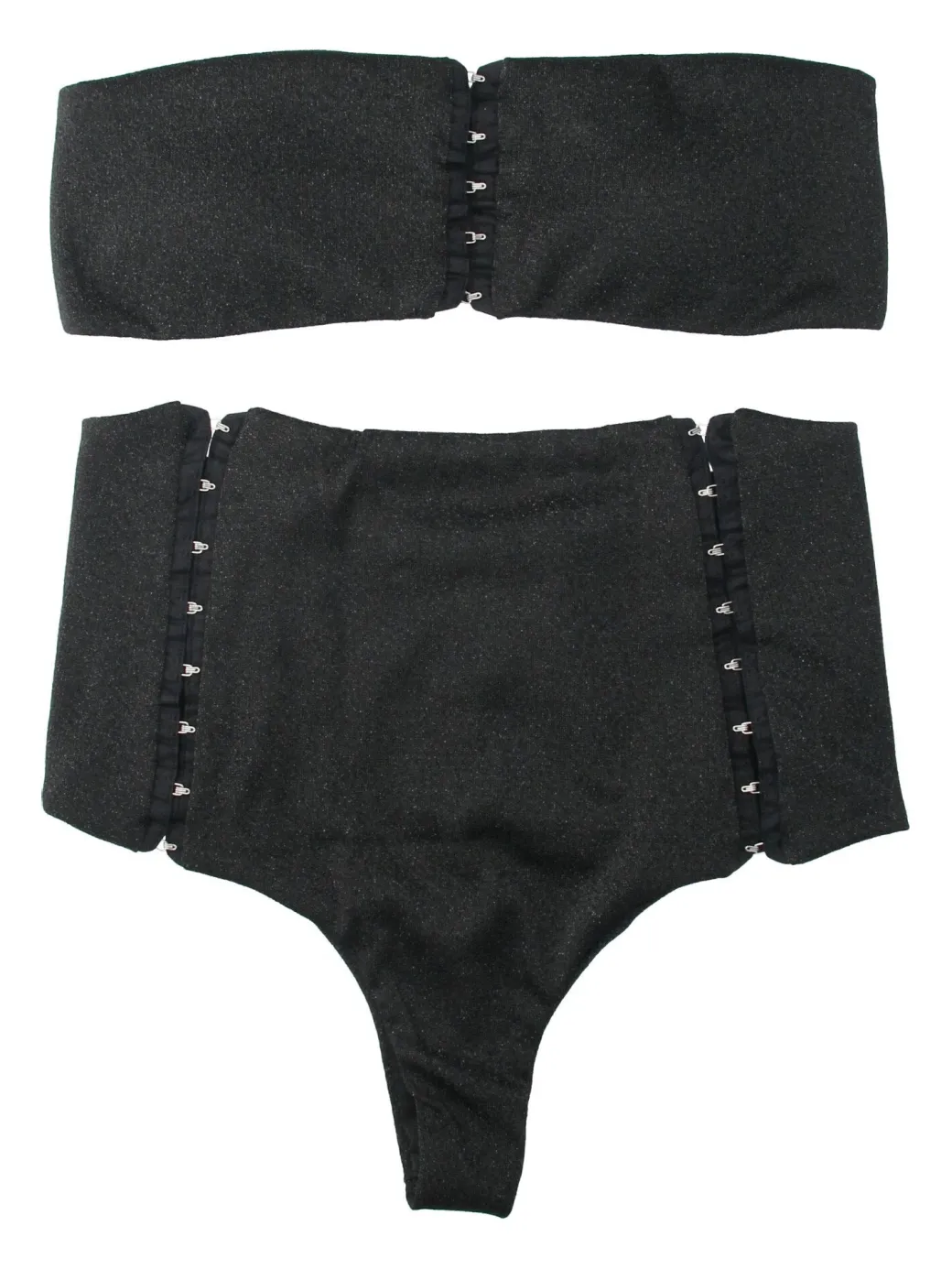 Sexy e minimal questo bikini Me Fui con top a fascia, slip a vita alta e tessuto illuminato da lurex. L’effetto lingerie è dato dai ganci da corsetteria, che seguono la linea dei fianchi rendendo l’insieme ancora più intrigante.