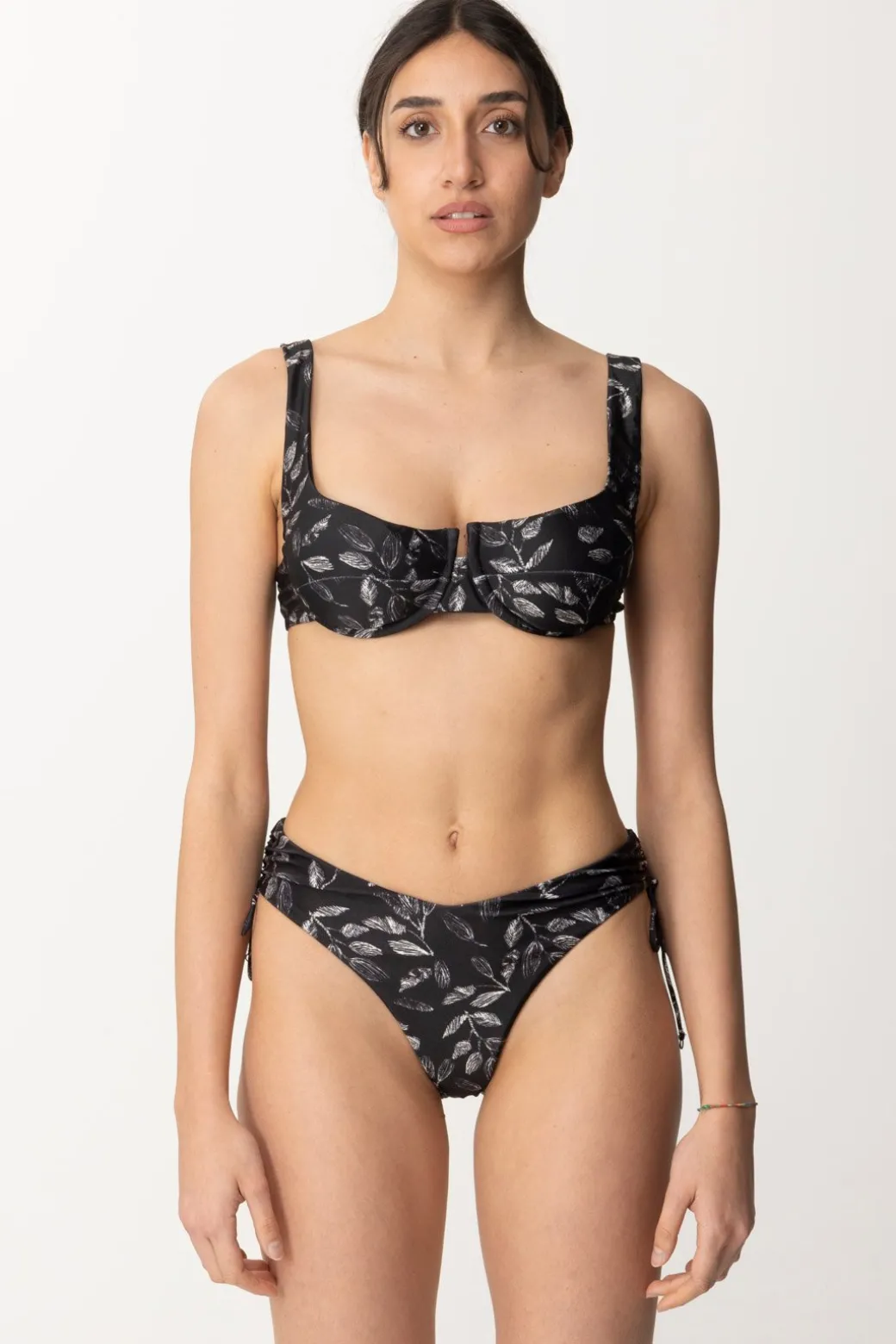 Delicata stampa foglie per un bikini Me fui in lycra lucida che sottolinea con altrettanta delicatezza le forme femminili grazie al top a reggiseno con ferretto e allo slip americano con laccetti per arricciare il fianco. Un capo dreamy per le tue giornate da sogno in spiaggia.