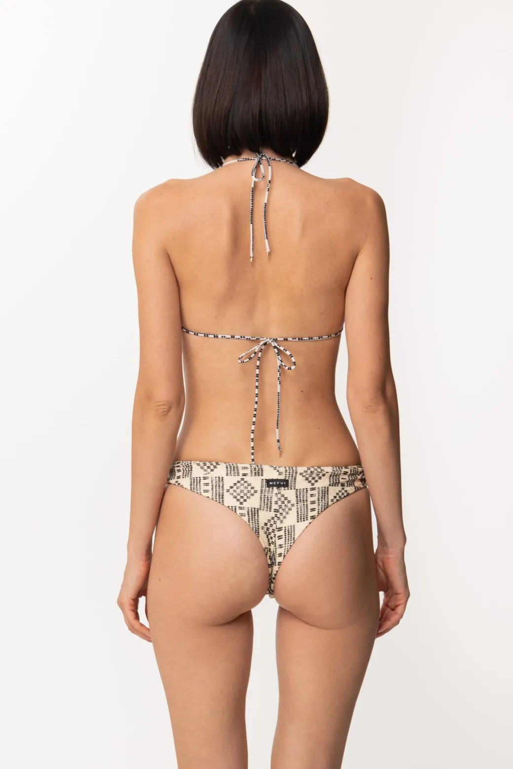 Bikini ME FUI dal modello a triangolo, il tessuto è interamente realizzato in rete stampato e abbellito da nodo centrale sul top e due sullo slip.