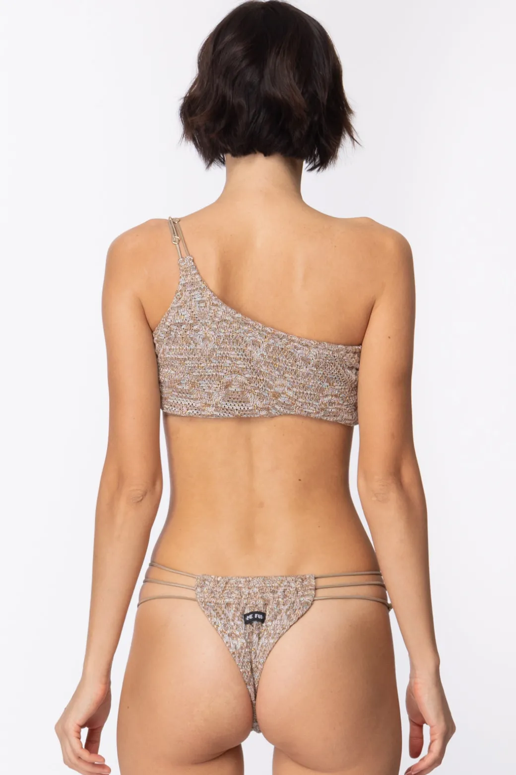Linea; Gran BazarAltissimo tasso di sensualità in questo bikini Me fui! Realizzato in maglia con lurex, sottili bande avvolgono i fianchi mentre il top è asimmetrico e monospalla.40%vi30%co22%pl 4%ea4%Si raccomanda lavaggio a mano in acqua tiepida
