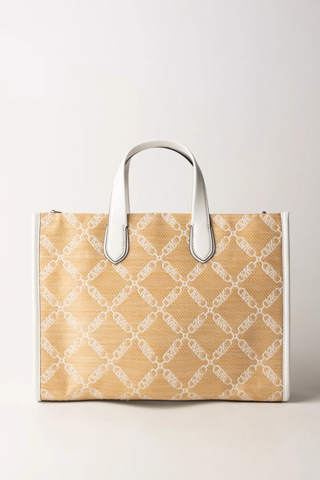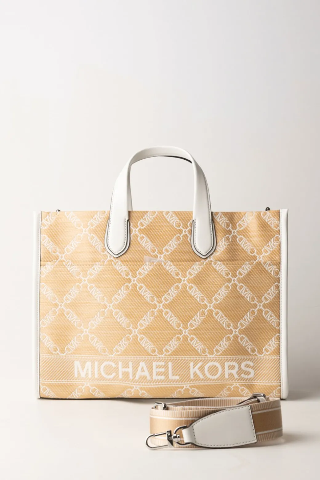 Stile moderno e comodità assicurata, cosa puoi desiderare di più dalla tua borsa? Questa Tote bag Michael Kors sarà la tua nuova compagna di avventure: design rigido e capiente, con un tessuto logato in paglia e tracolla abbinata. Riponi ogni necessità al suo interno e sei pronta per affrontare la città con stile!