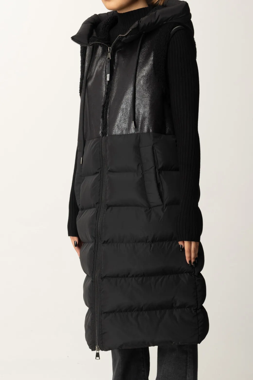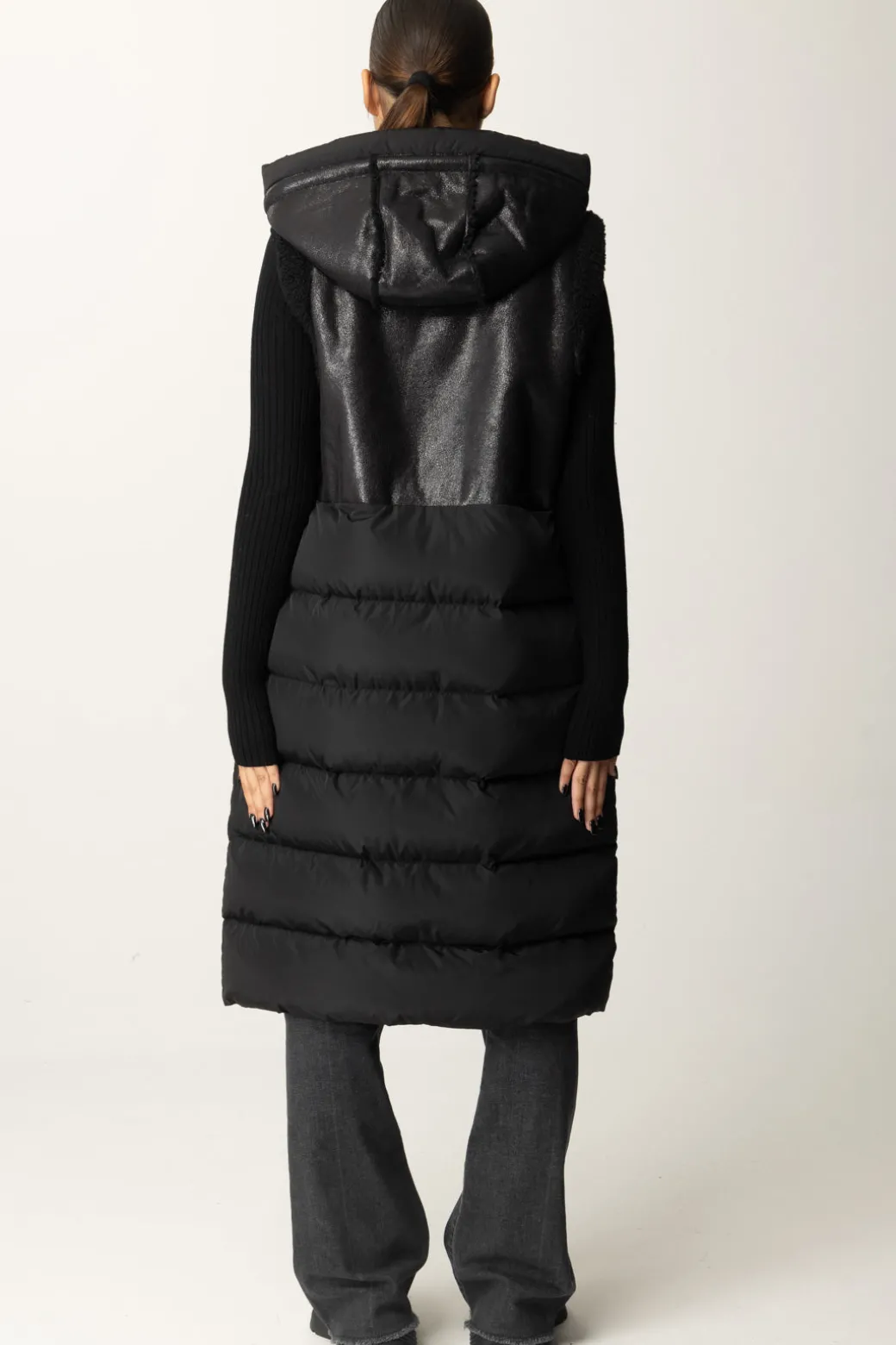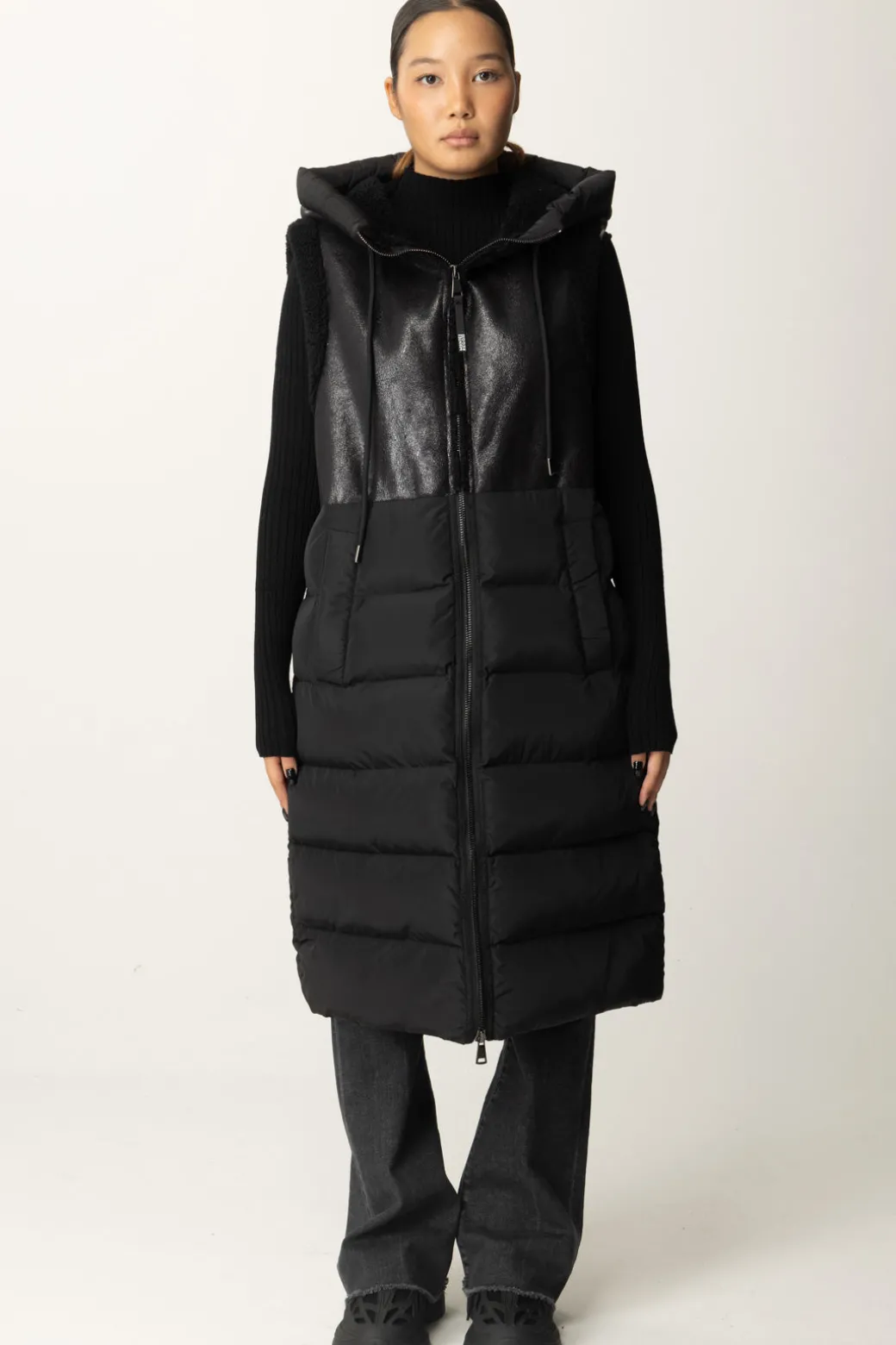 Gilet Montereggi realizzato con un contrasto di tessuti: la parte superiore in pelle leggermente lucida, con effetto smanicato che viene impreziosito da bordi effetto teddy e berretto in poliestere imbottito che richiama la parte inferiore che appare voluminosa e confortevole. L’unione perfetta tra stile moderno e stile sportivo