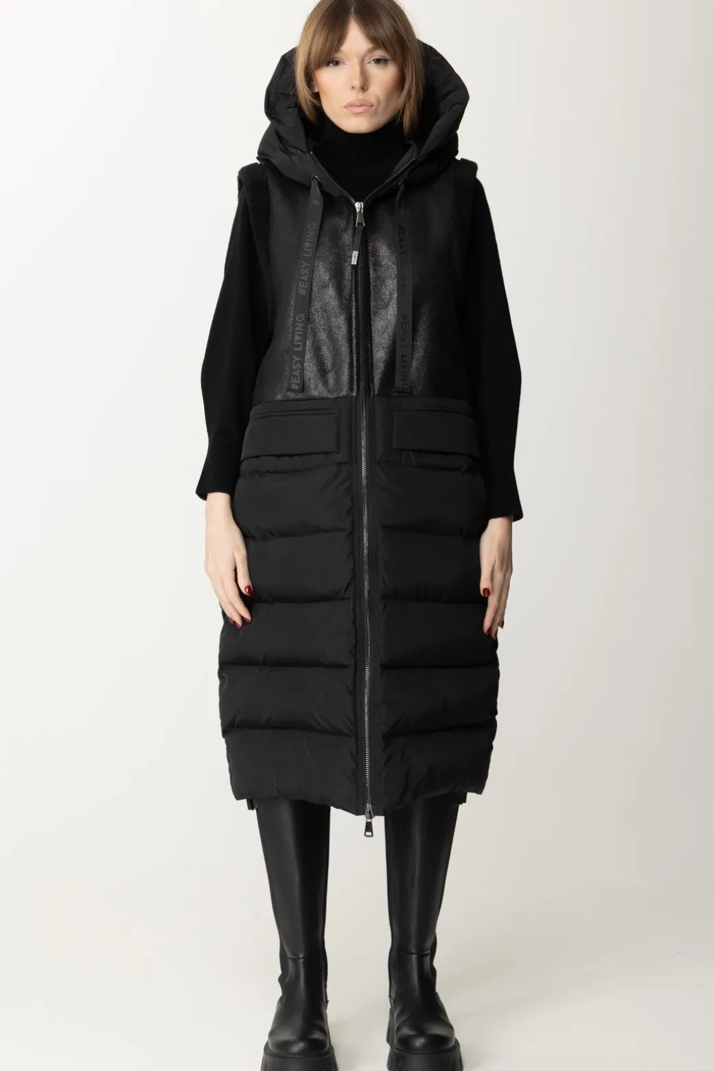 Gilet firmato Montereggi realizzato con un contrasto di tessuti: la parte superiore in pelle leggermente lucida, con effetto smanicato che viene impreziosito da bordi in velluto e berretto in poliestere imbottito che richiama la parte inferiore che appare voluminosa e confortevole. L’unione perfetta tra stile moderno e stile sportivo.
