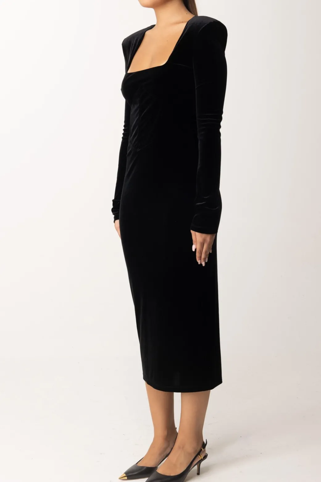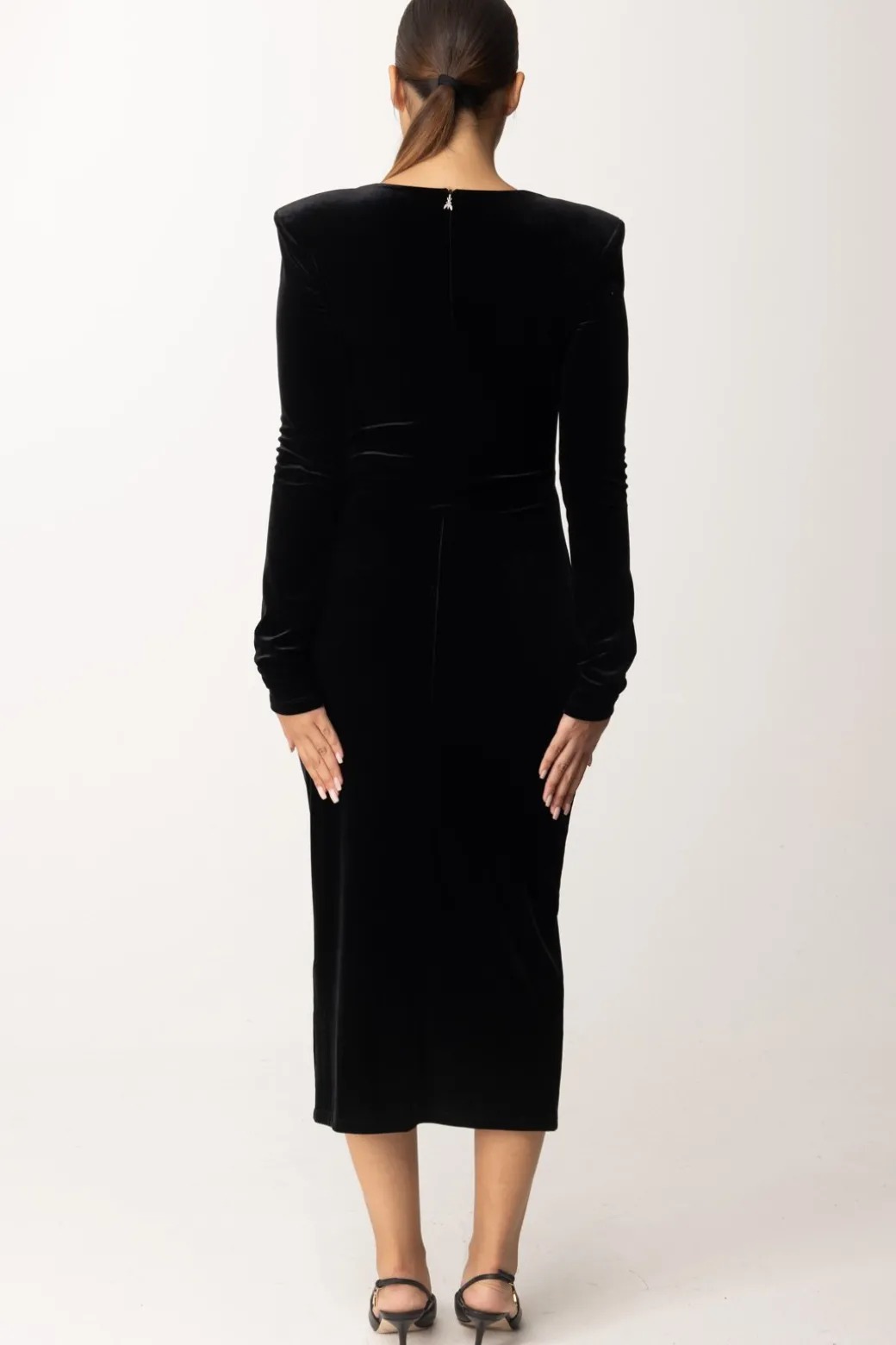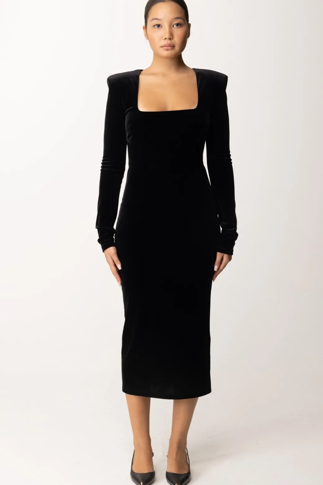 Questo abito Patrizia Pepe dal modello midi, è realizzato in elegante velluto, per un perfetto fascino di eleganza adatto alla stagione fredda. Le spalle strutturate e la scollatura squadrata donano una silhouette slanciata e moderna, il che lo rende ideale per una serata speciale, abbinalo con tacchi alti e gioielli minimal per un look sofisticato e senza tempo.