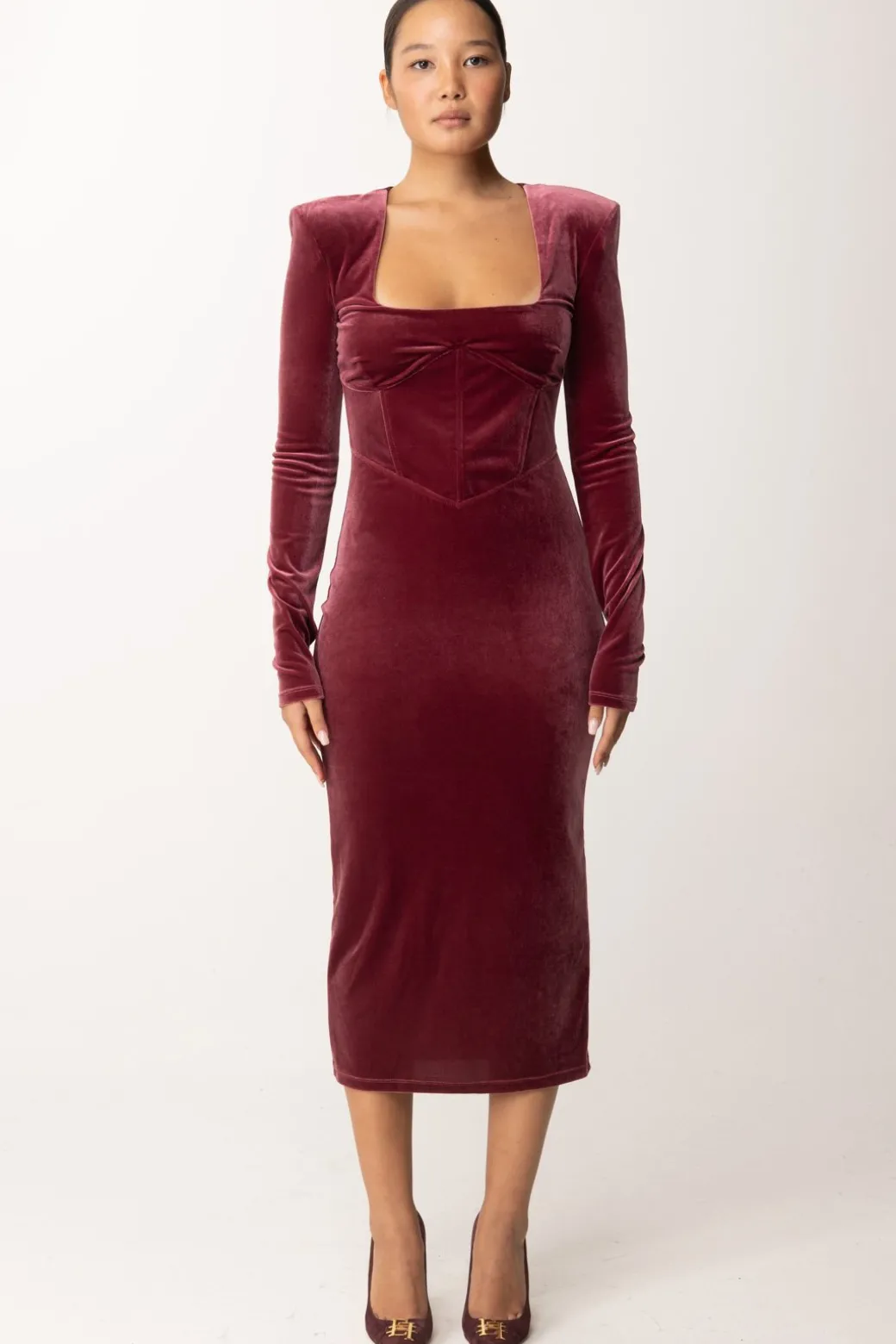 Questo abito Patrizia Pepe dal modello midi, è realizzato in elegante velluto, per un perfetto fascino di eleganza adatto alla stagione fredda. Le spalle strutturate e la scollatura squadrata donano una silhouette slanciata e moderna, il che lo rende ideale per una serata speciale, abbinalo con tacchi alti e gioielli minimal per un look sofisticato e senza tempo.