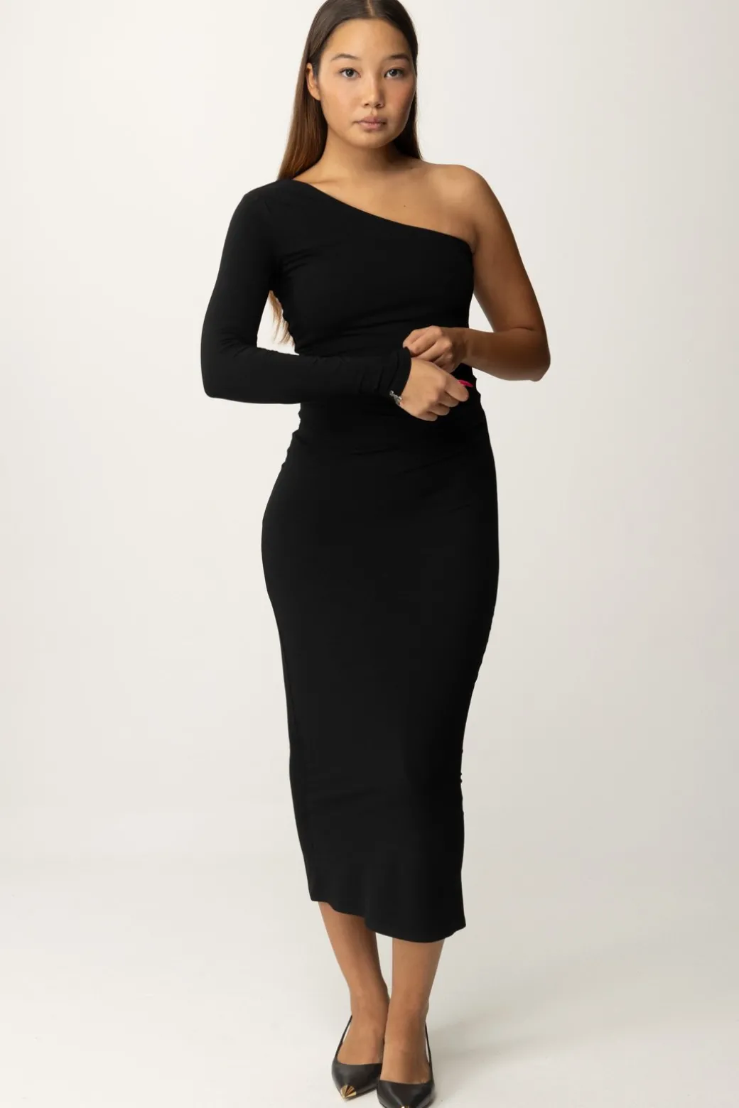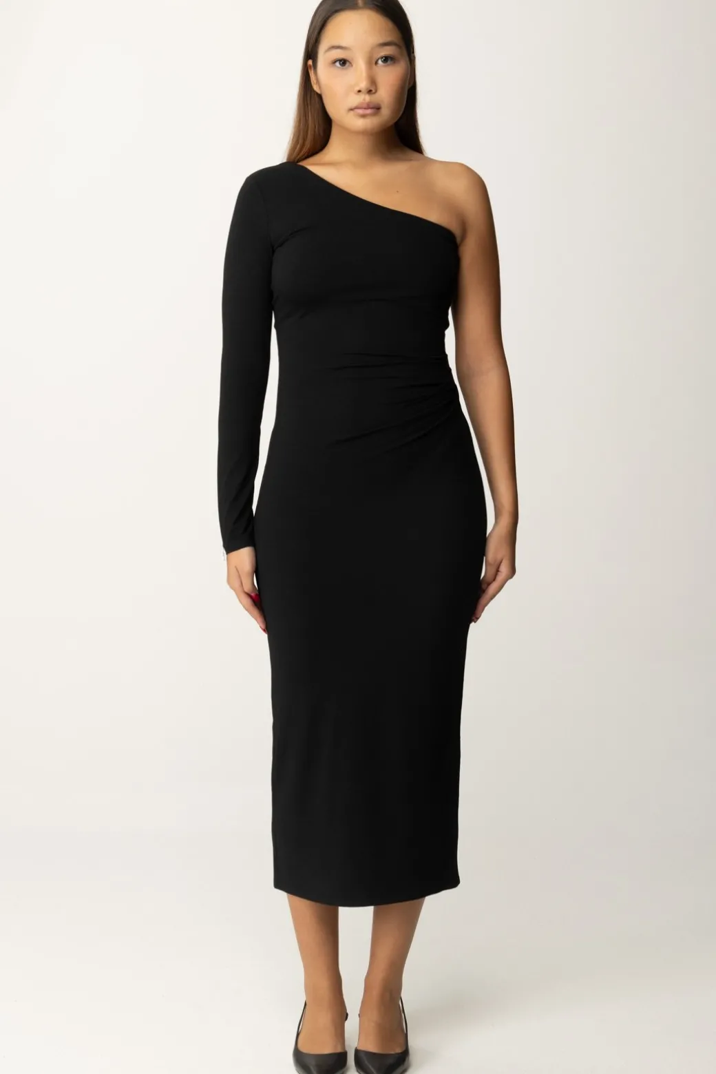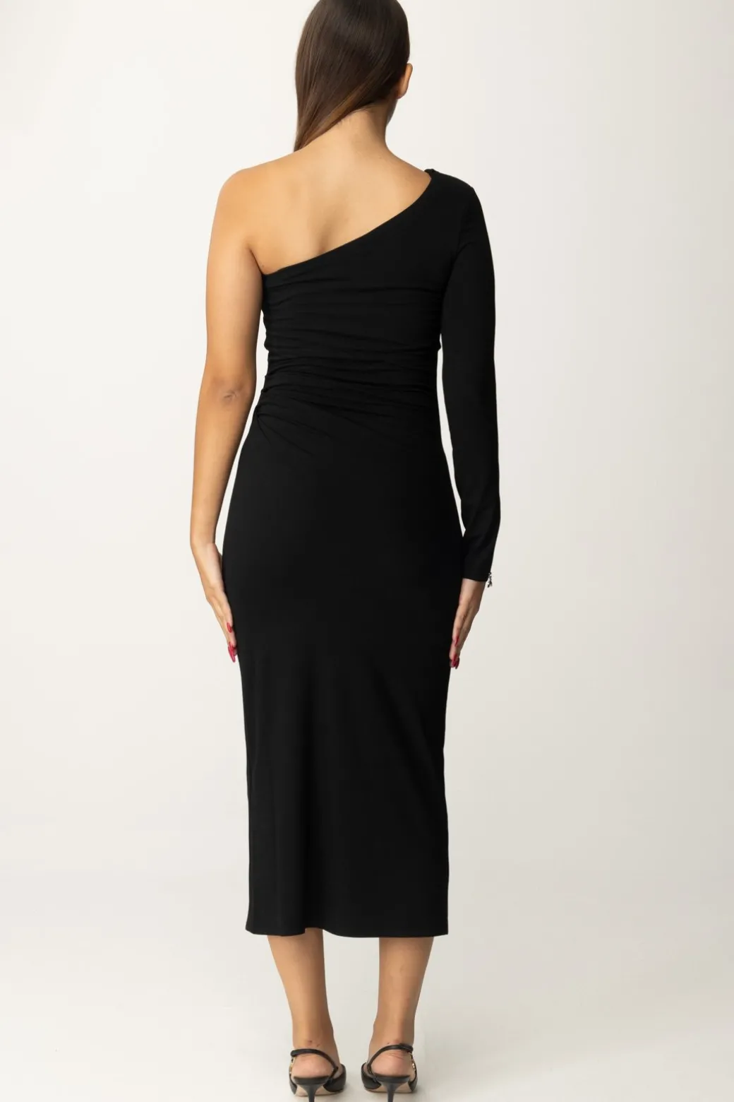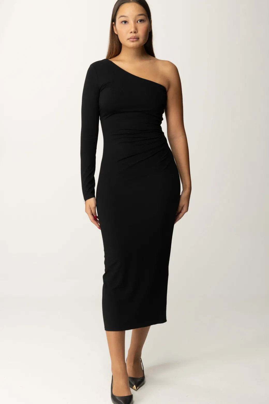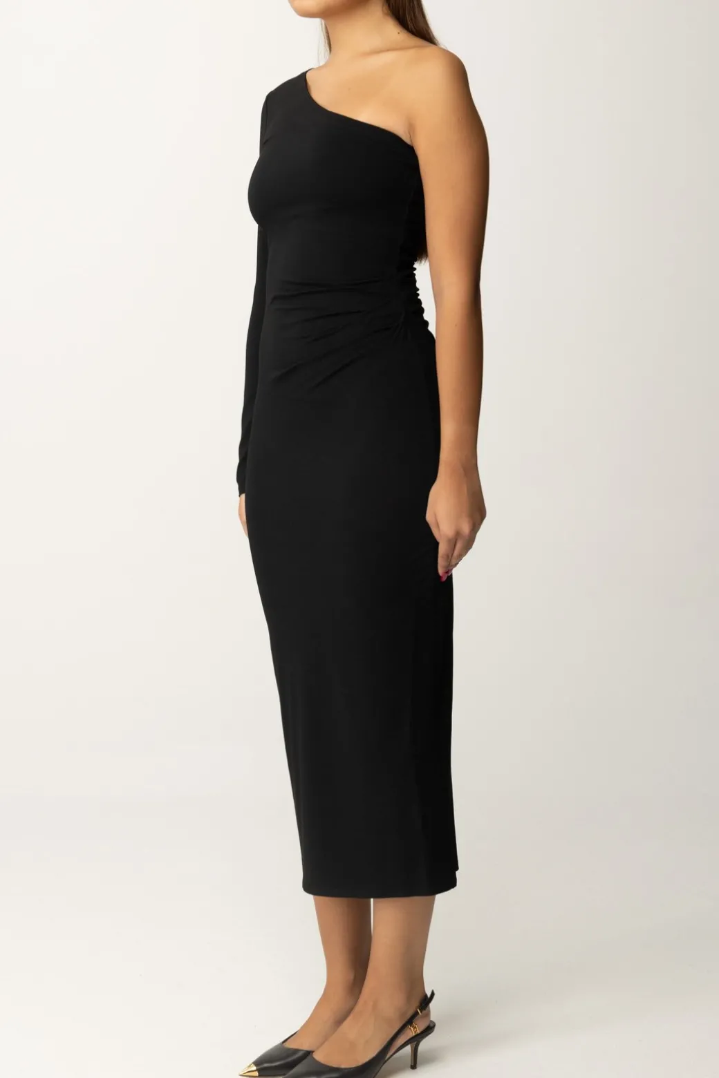 Questo abito Patrizia Pepe con il suo fit aderente e design monospalla, esprime eleganza minimal con un tocco di sensualità. La lunghezza aggiunge raffinatezza, mentre la spalla scoperta gli dona un lato femminile. Completa il look con un paio di décolleté nude o metallizzate per allungare la figura.