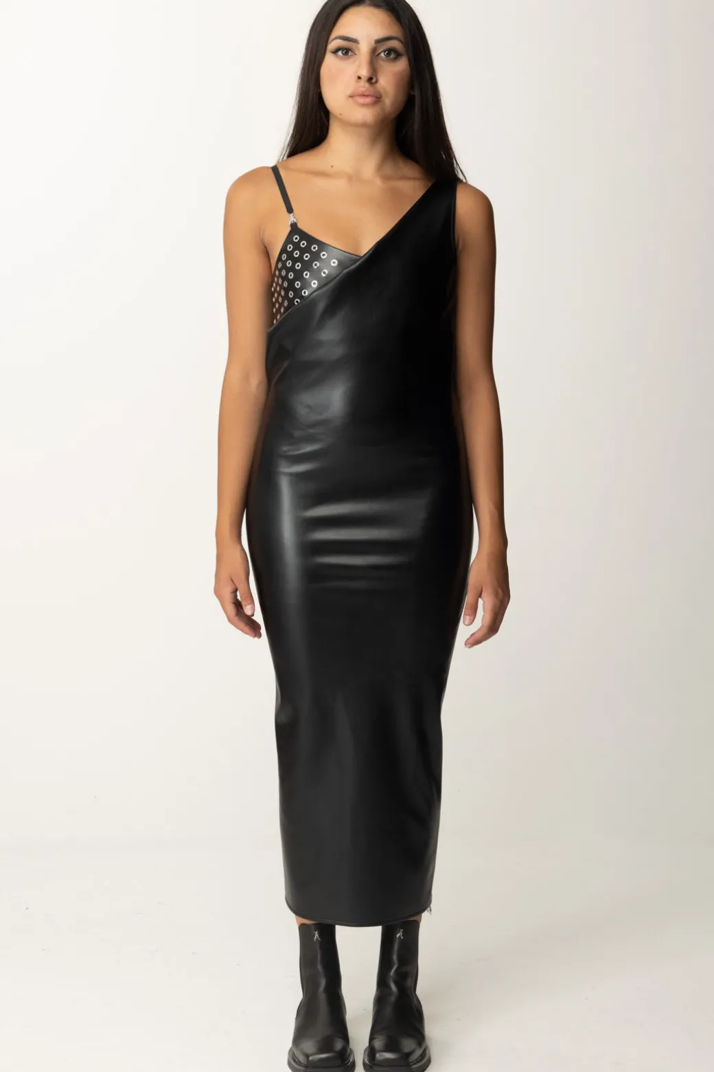 Questo abito midi Patrizia Pepe in ecopelle è un mix di grinta e sensualità. Caratterizzato da una spallina sottile e una più spessa, in quella più sottile la parte del seno presenta l’iconico logo Fly e una serie di eyelettes. Lungo la gonna è presente uno spacco laterale regolabile che con zip argentata e il logo fly che aggiungono un tocco contemporaneo. Perfetto con sandali alti per un look serale audace.