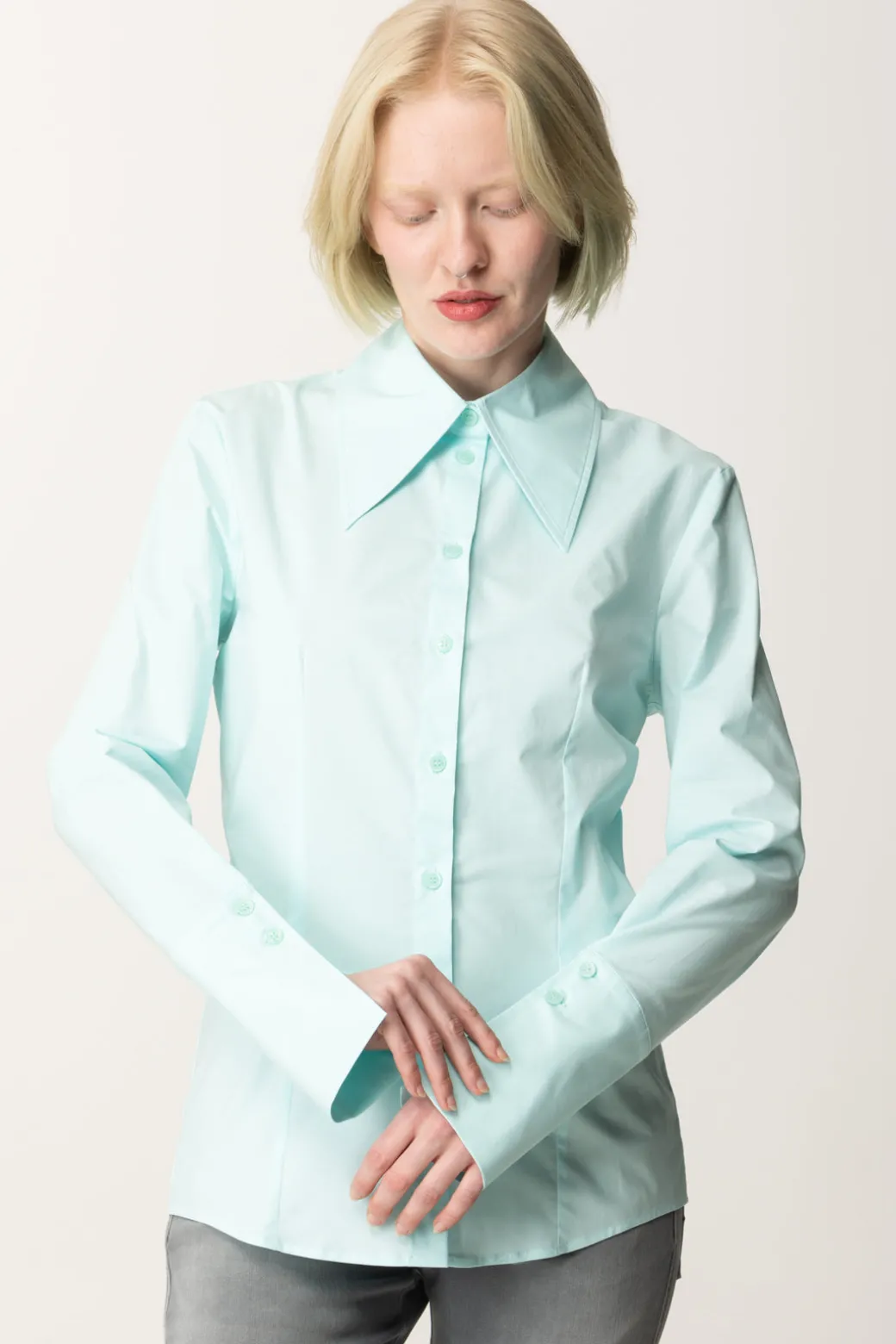 Un capo essenziale rivisitato con dettagli moderni, questa camicia Patrizia Pepe fitted presenta un colletto oversize che aggiunge un tocco sofisticato e un design semplice e versatile, perfetta per outfit da ufficio o per una serata casual chic, si abbina perfettamente a pantaloni a vita alta o denim cropped.