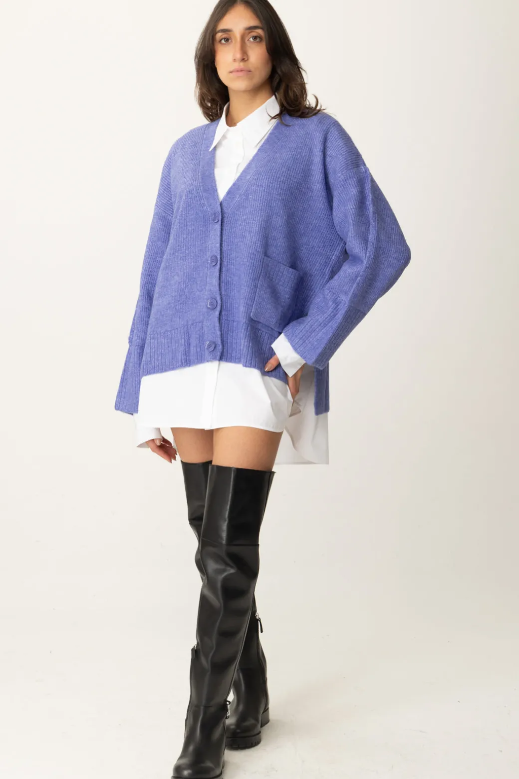 Un cardigan Patrizia Pepe dal taglio over, perfetto per la stagione invernale. Le spalle cadenti e i bottoni tono su tono lo rendono un pezzo statement, perfetto da abbinare sia a pantaloni che gonne. Indossalo sopra una camicia per un vibe preppy moderno o da solo per un appeal cozy..