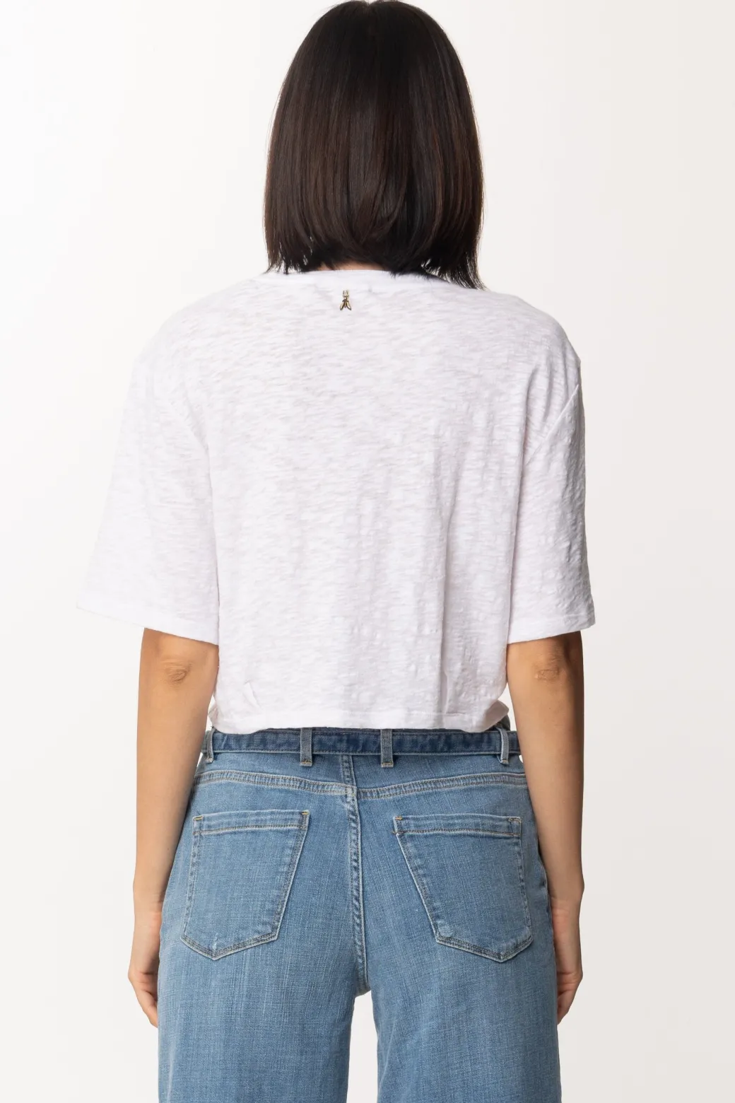 Una proposta Patrizia Pepe d’ispirazione vintage, super fresca e stilosa. Una t-shirt dal taglio crop in morbido cotone e lino, caratterizzata dal dettaglio tartarugato frontale. Un capo perfetto per i tuoi outfit di ogni giorno
