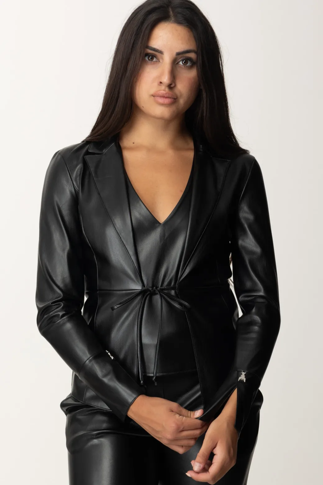 Giacca Patrizia Pepe in similpelle da indossare in modi divers iche giocano con la tua audacia. maniche lunghe con spacchetti, chiusura con laccetti e colletto con revers, indossala con il suo top in pelle, o ancora con t-shirt stampate per outfit casual ma grintosi. E che dire di una semplice bralette o un crop super top per i tuoi look più sfrontati e catchy?