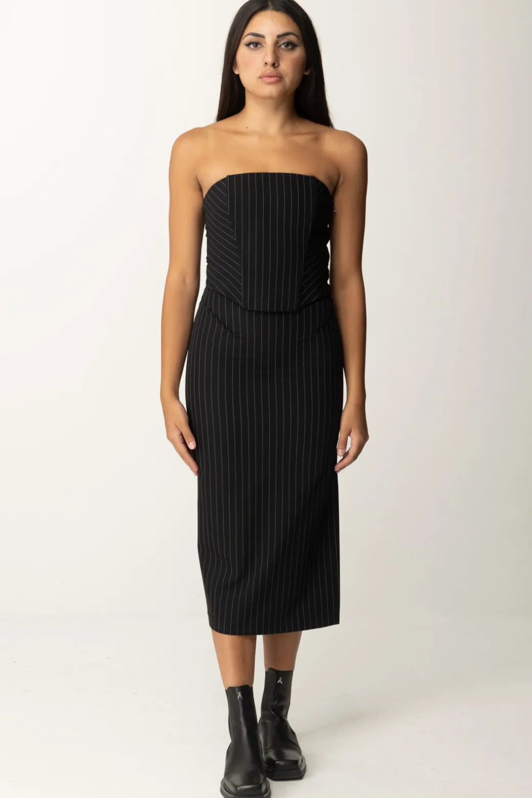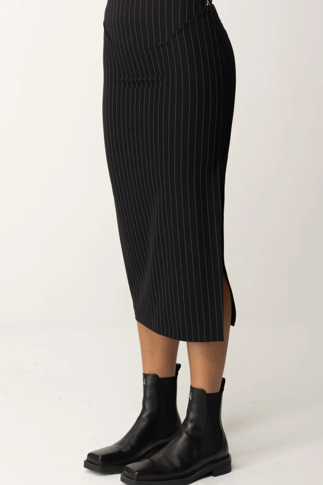 Eleganza classica per questa gonna midi Patrizia Pepe in tessuto gessato, che si presta benissimo ad accompagnarti nelle tue giornate da ufficio, per i tuoi eventi business ma anche per una serata chic, con un bel top e dei tacchi svettanti. Aderente, aderentissima: lo spacco laterale aggiunge un utleriore tocco catchy al tuo look, ma ti agevola anche nei movimenti.