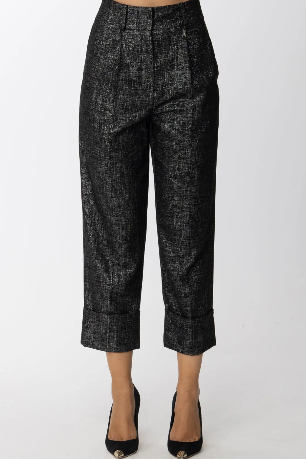 Se ti piace brillare con ogni tuo outfit, di certo non puoi lasciarti scappare questi Pantaloni in lurex Patrizia Pepe. Linea a vita alta, con taglio corto e maxi risvolti, in perfetto coordinato c’è anche la giacca che completerà il perfetto look da sera accessoriato a seconda del tuo mood!