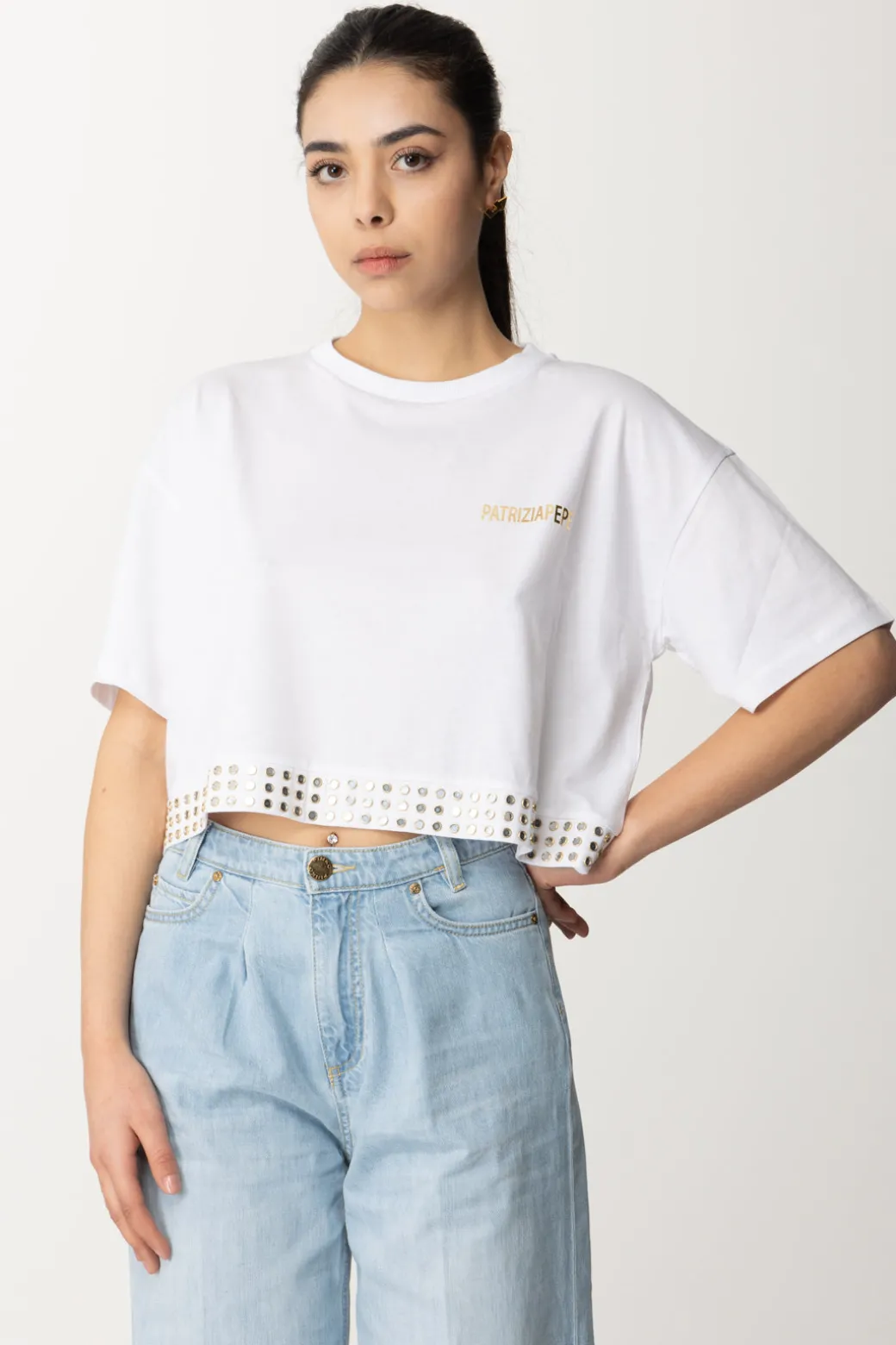 Una t-shirt Patrizia Pepe corta dallo spirito grintoso, impreziosita da borchiette sul fondo che donano un tocco rock. Il logo laminato posizionato su un lato aggiunge un elemento di stile distintivo. Perfetta per un look casual ma alla moda, questa t-shirt si presta a molteplici abbinamenti, garantendo un tocco di originalità.