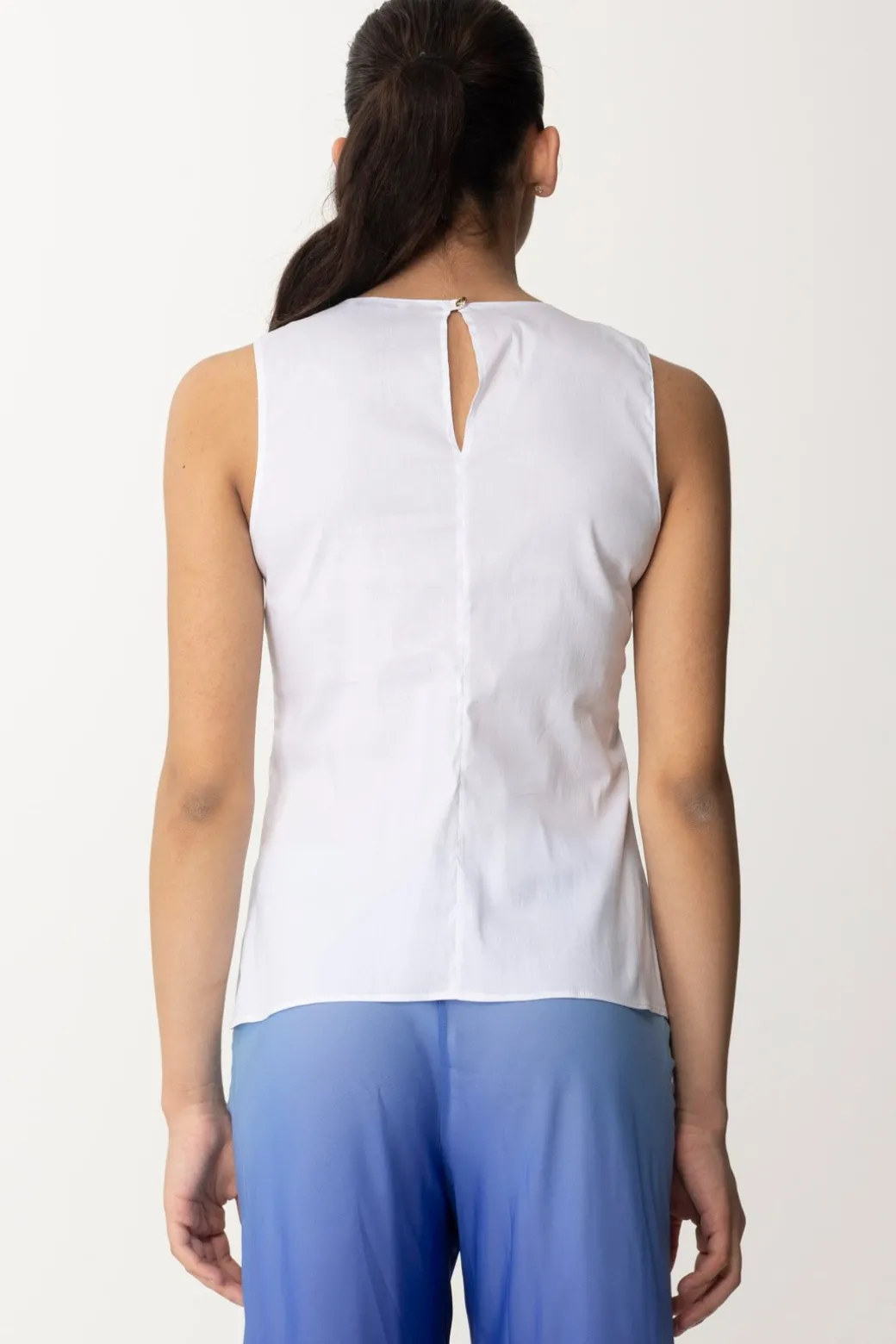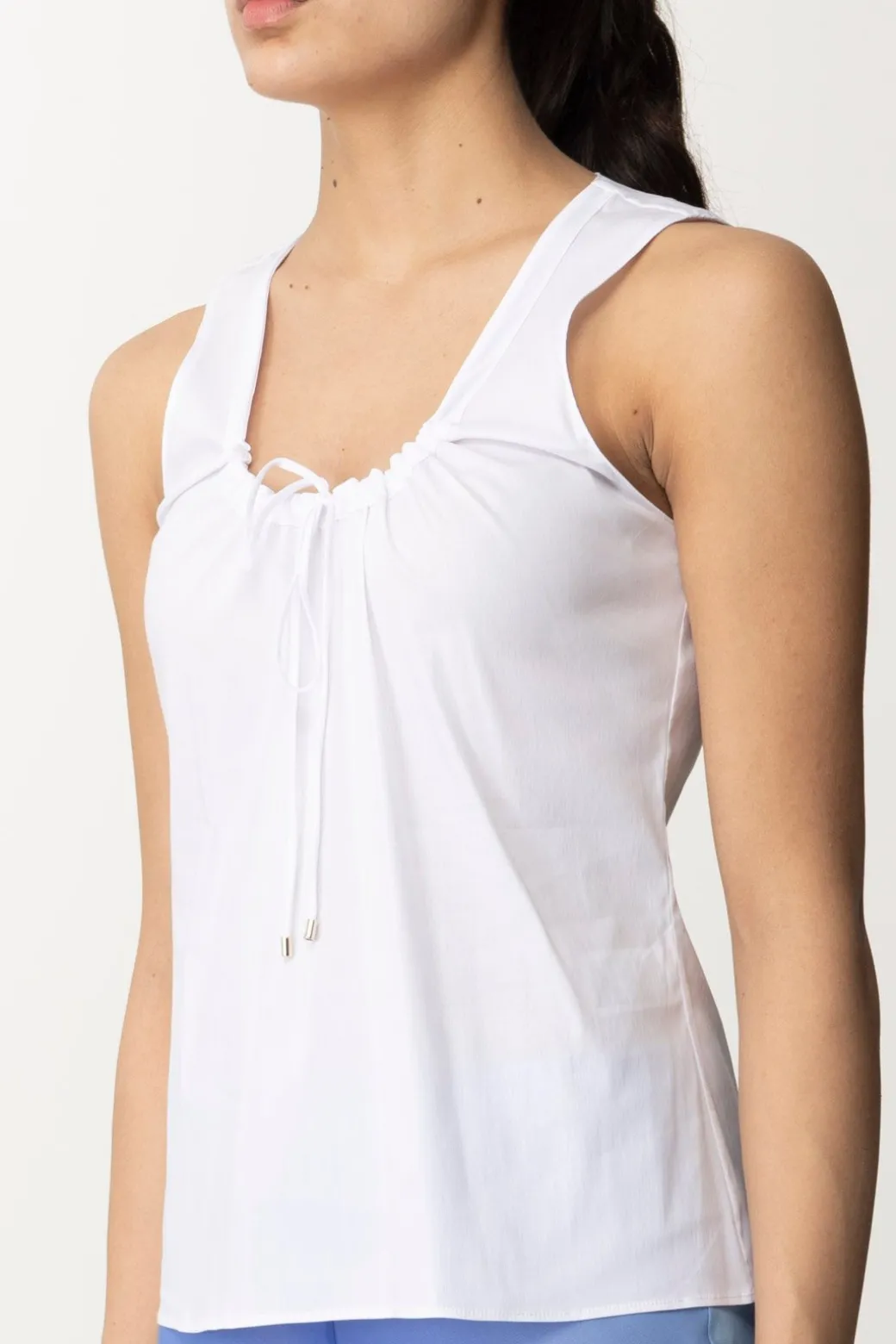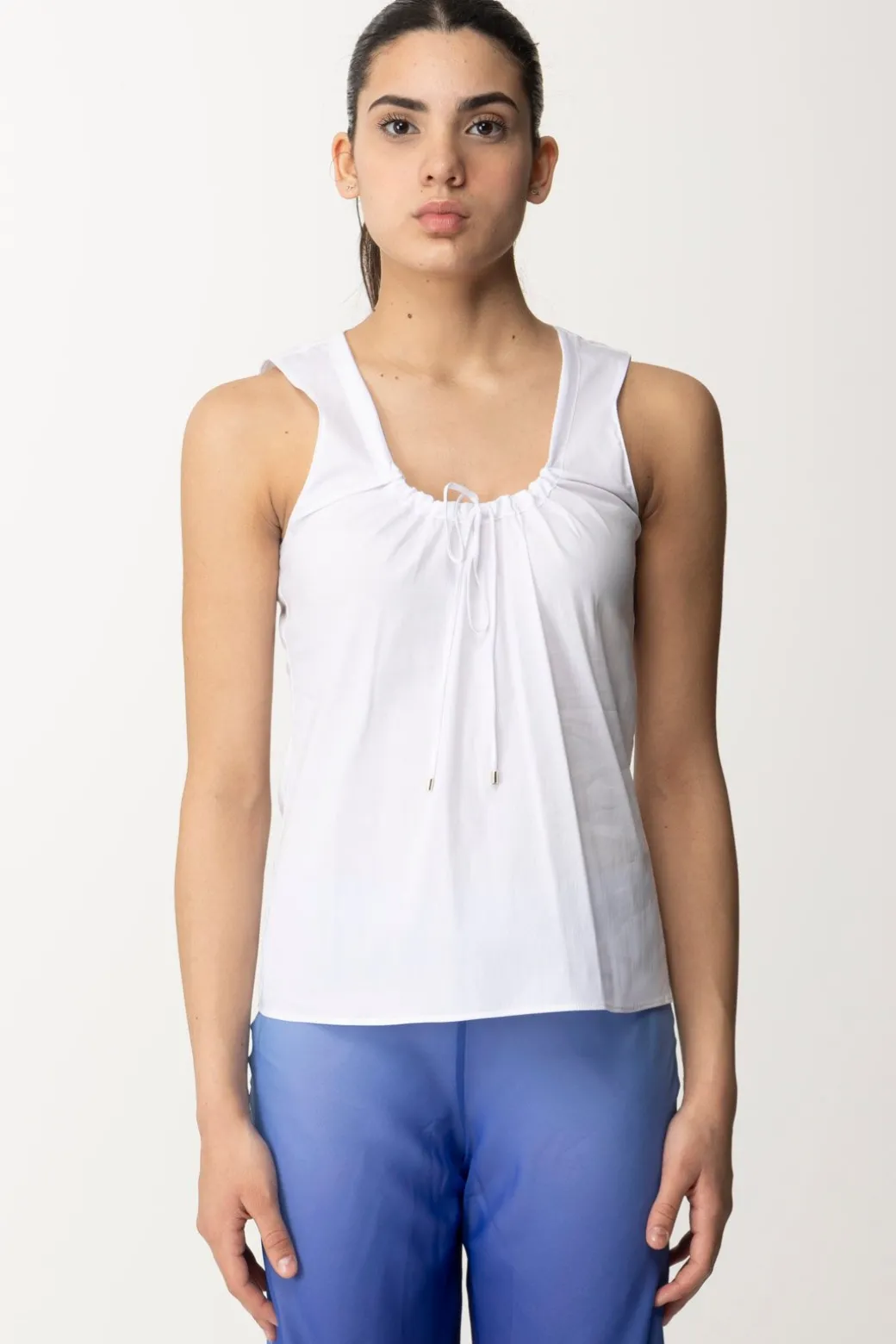 Top Patrizia Pepe per un tocco di eleganza giocosa. Ha uno scollo rotondo impreziosito da un fiocco annodabile, perfetto per aggiungere un dettaglio chic al tuo outfit.